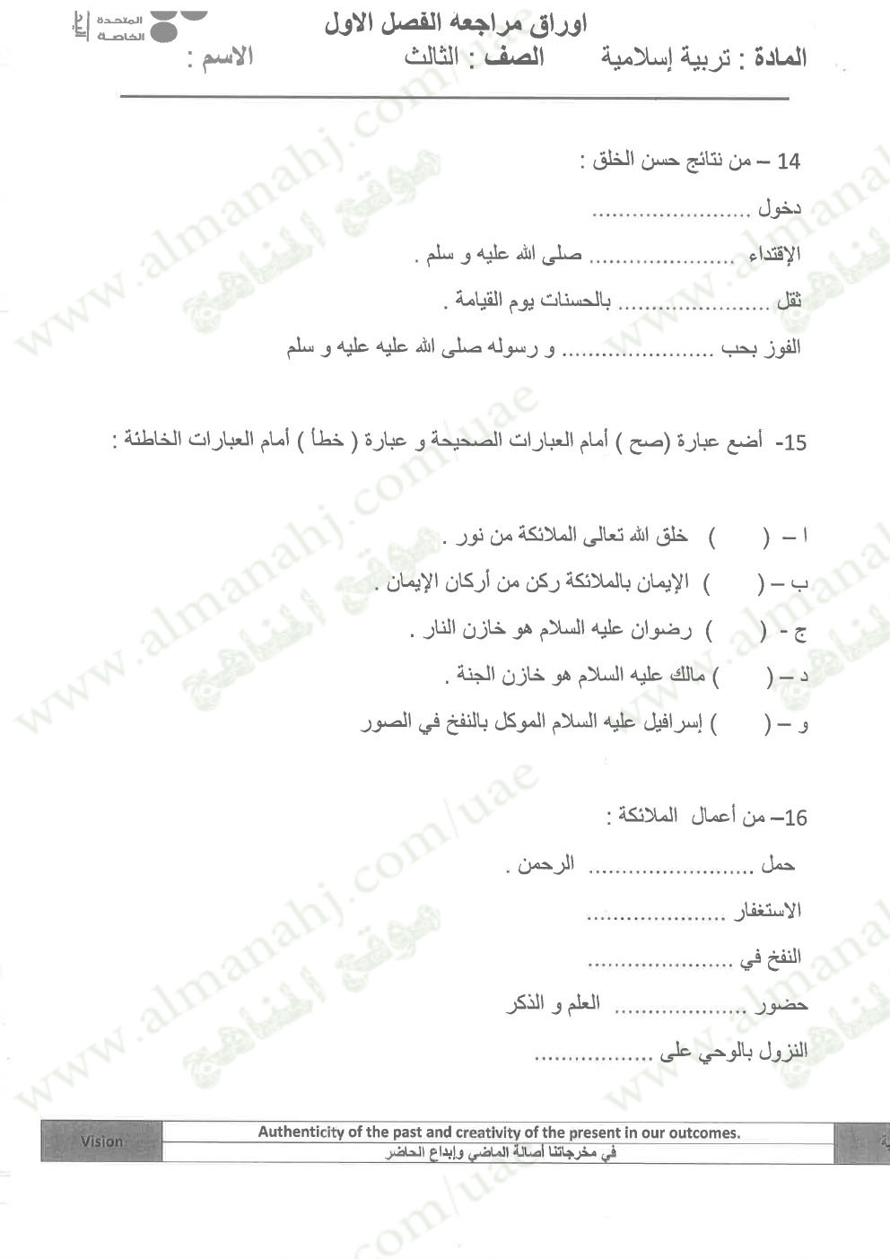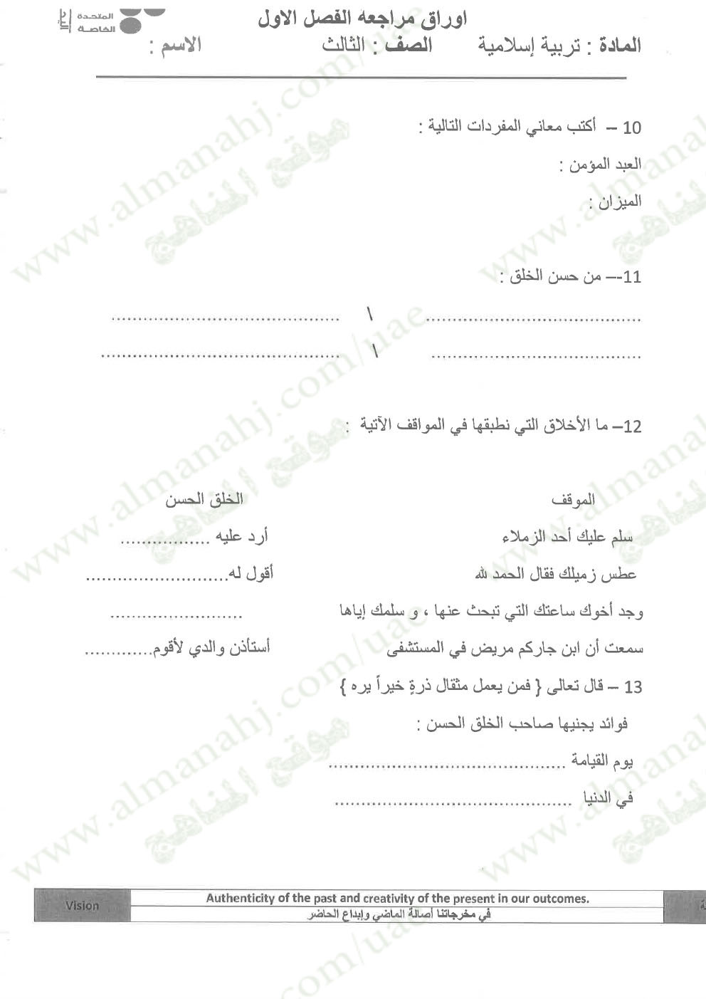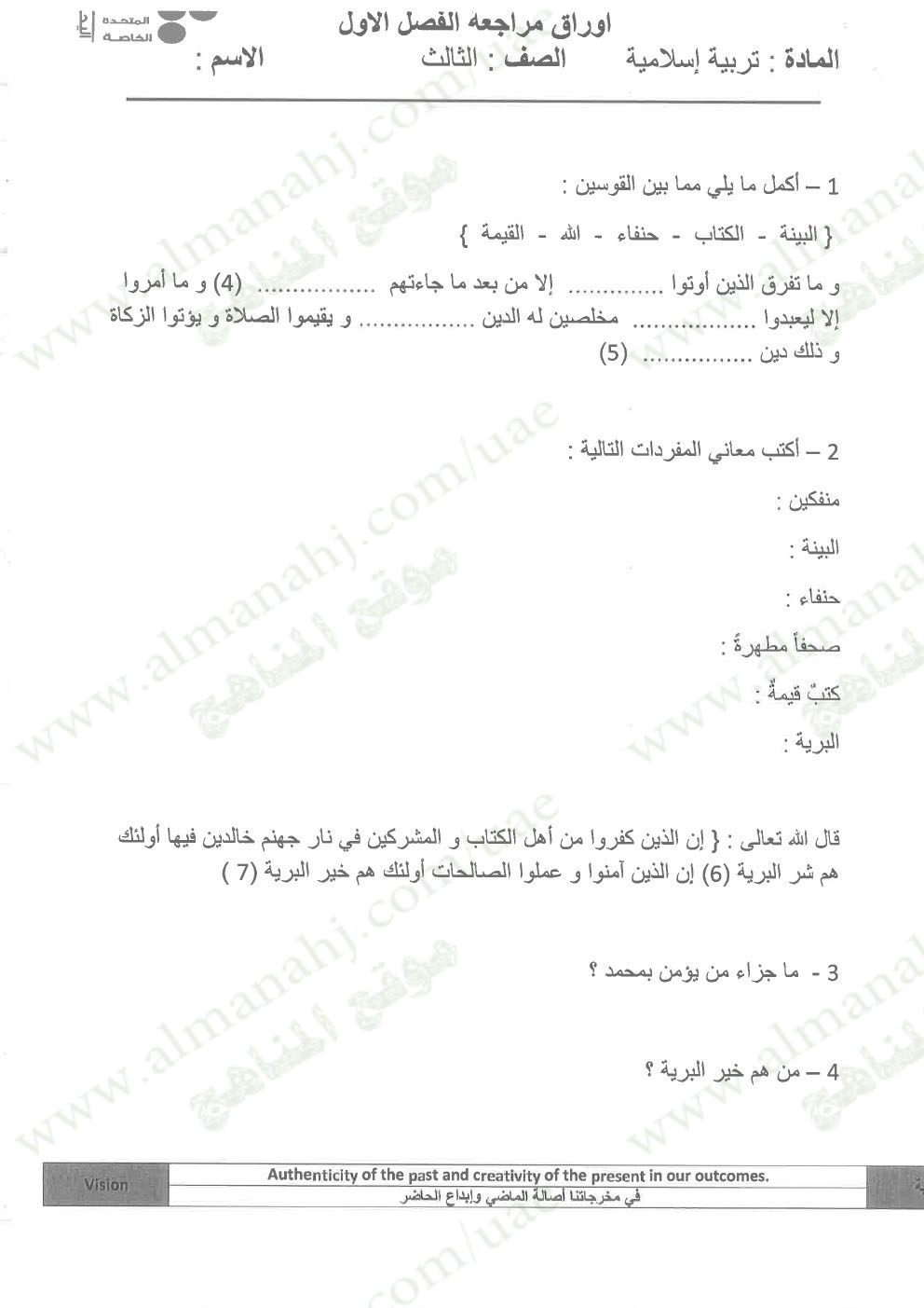 معلومات الملف: الصف الثالث, الفصل الأول, تربية اسلامية, 2017-2018, مراجعة تحضيراً لامتحان نهاية الفصل الاول مع الحل | |||