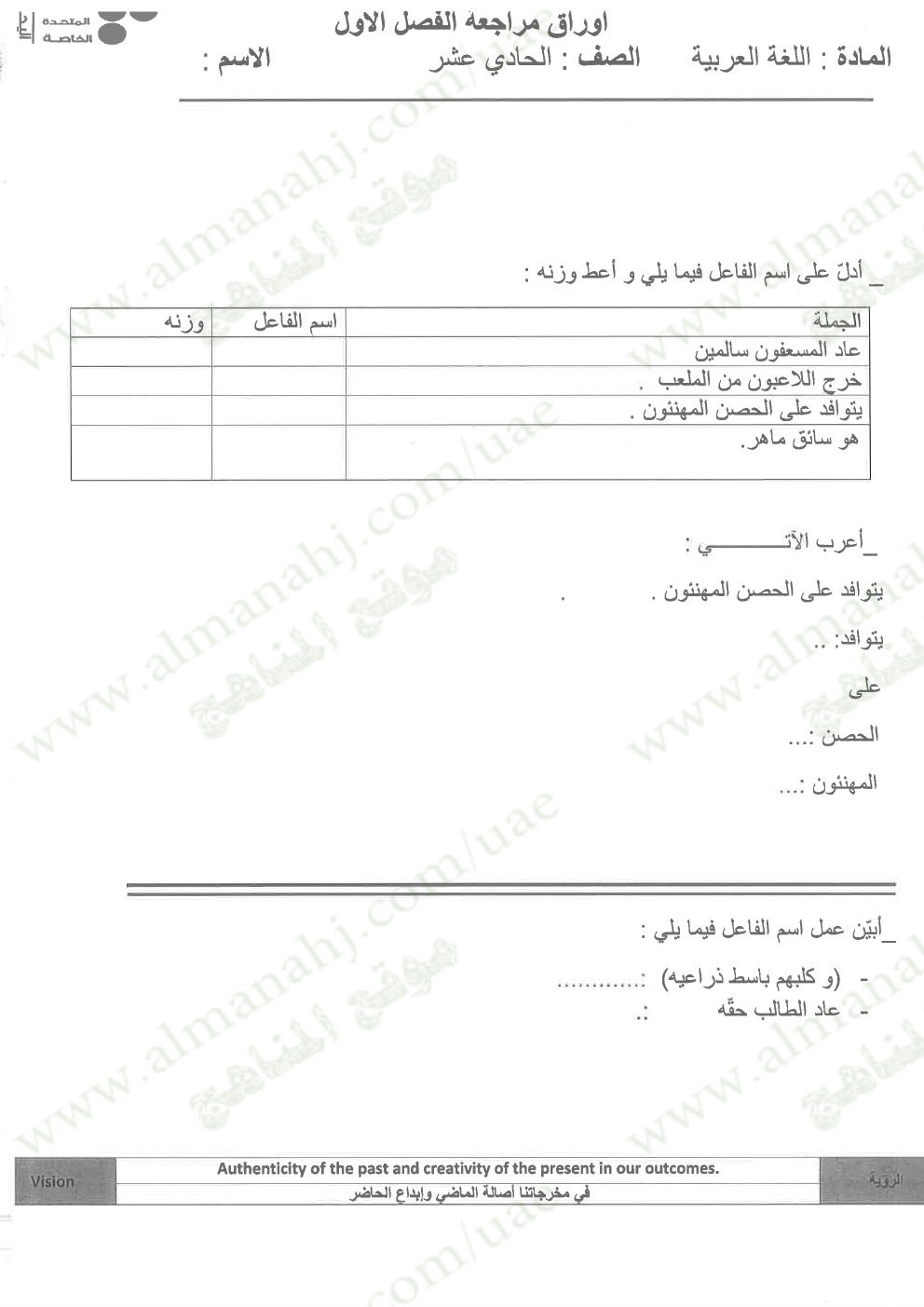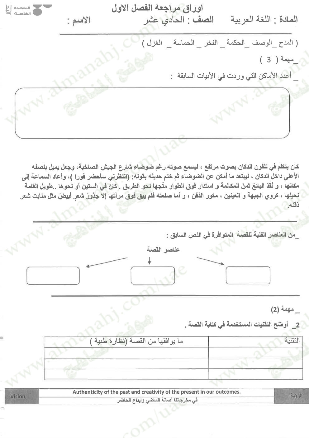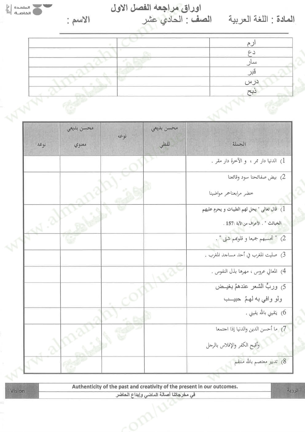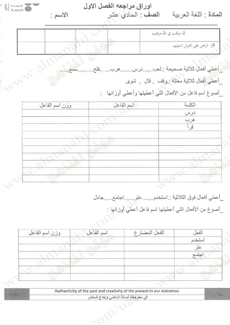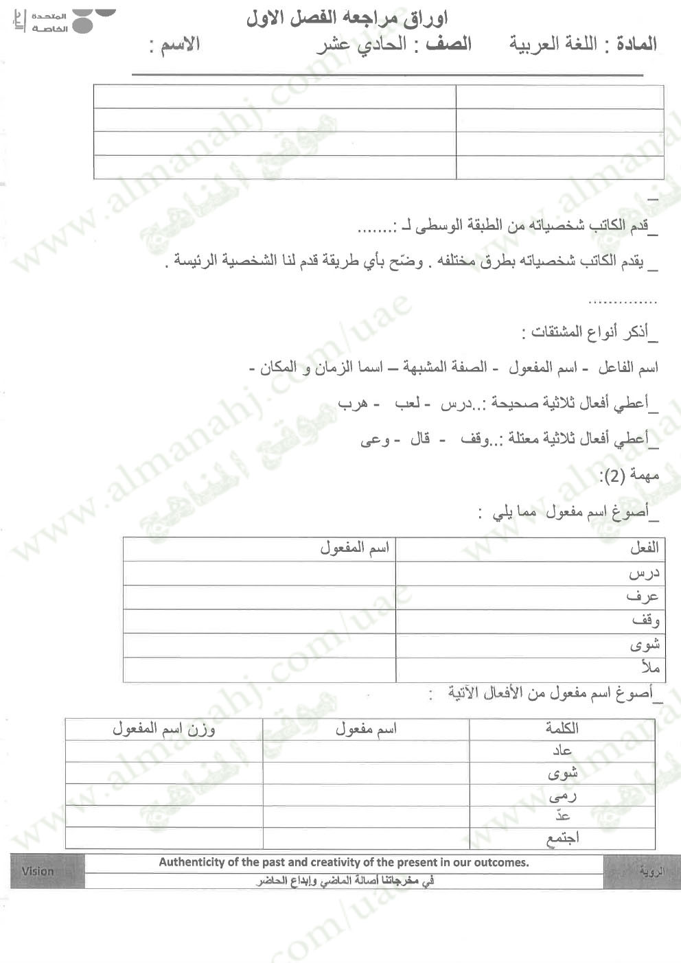 معلومات الملف: الصف الحادي عشر, الفصل الأول, لغة عربية, 2017-2018, أوراق مراجعة لامتحان نهاية الفصل الاول مع الحل | |||