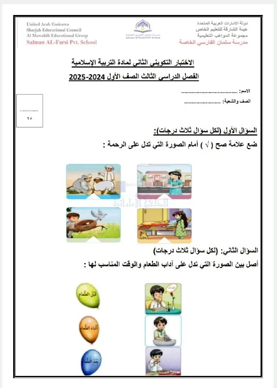 | الاختبار التكويني الثاني بدون الإجابات - إعداد: مدرسة سلمان الفارسي الخاصة | ||