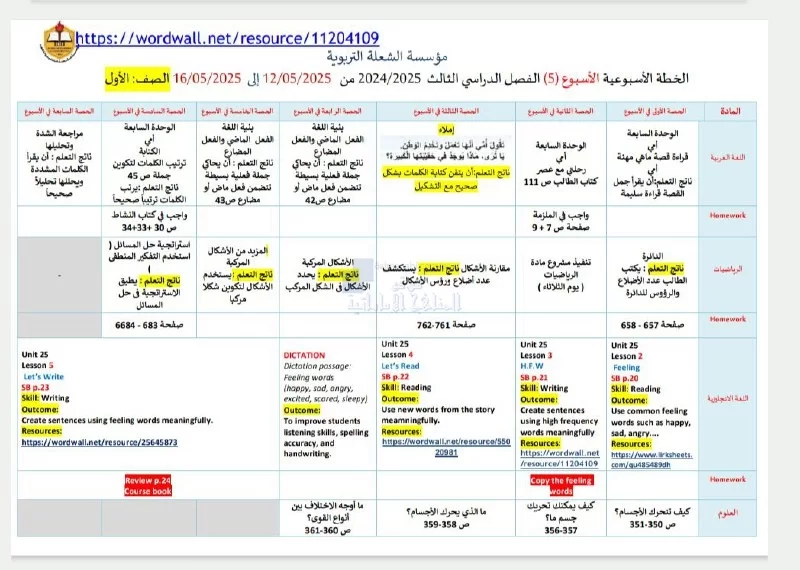 تم إيجاد الملف: الخطة الأسبوعية الأسبوع الخامس لجميع الصفوف من مدرسة الشعلة الخاصة