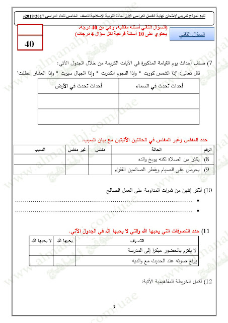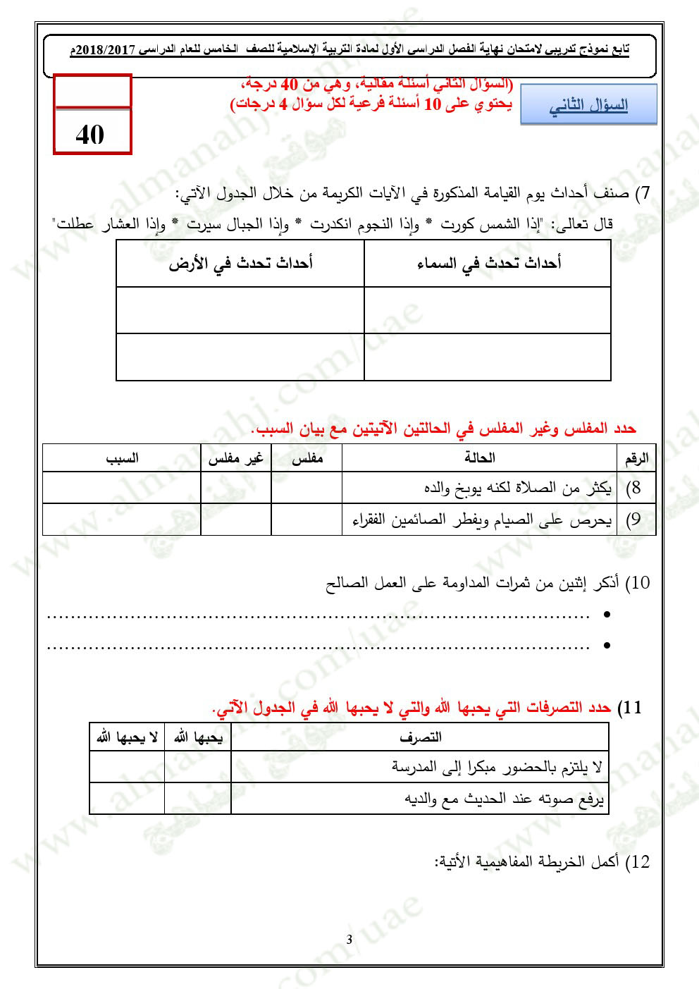 معلومات الملف: الصف الخامس, الفصل الأول, تربية اسلامية, 2017-2018, النموذج التدريبي الرسمي لامتحان نهاية الفصل الاول | |||