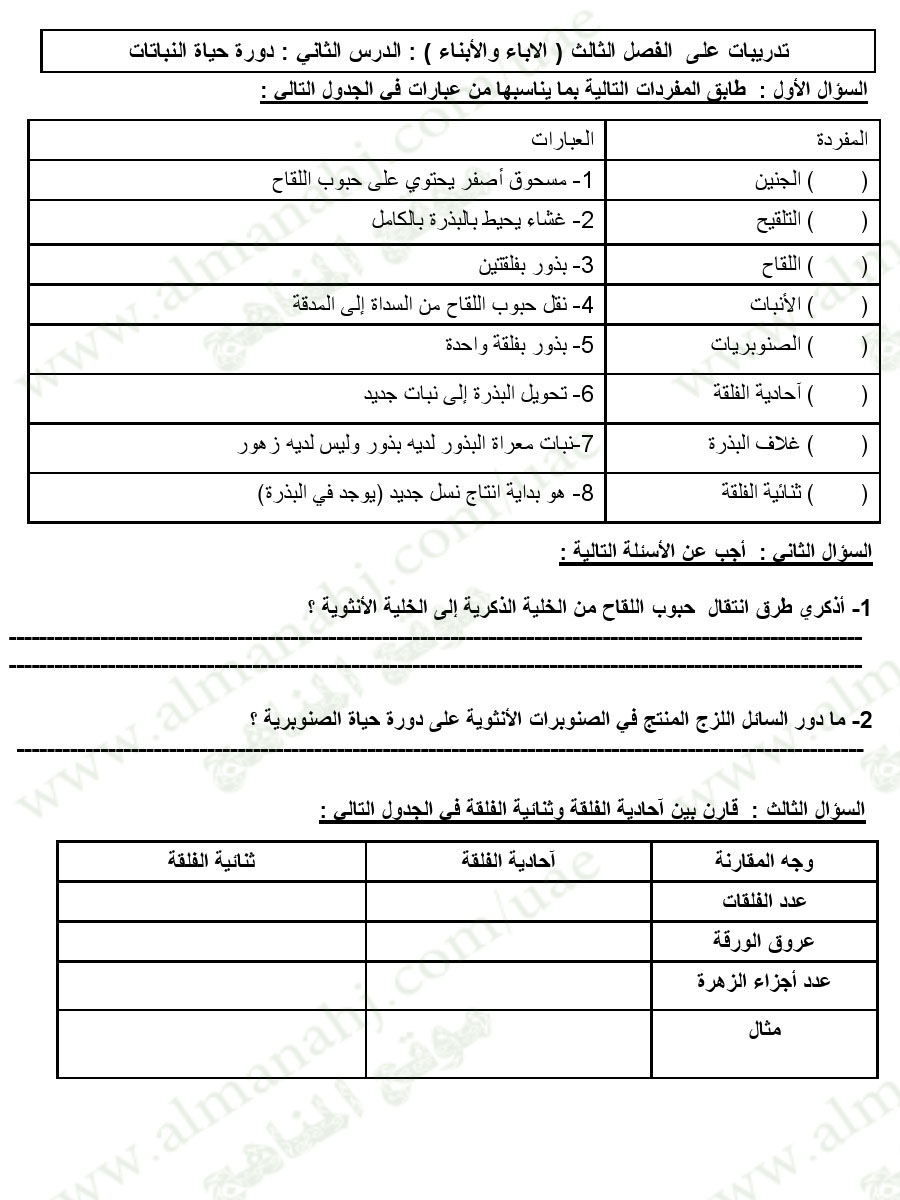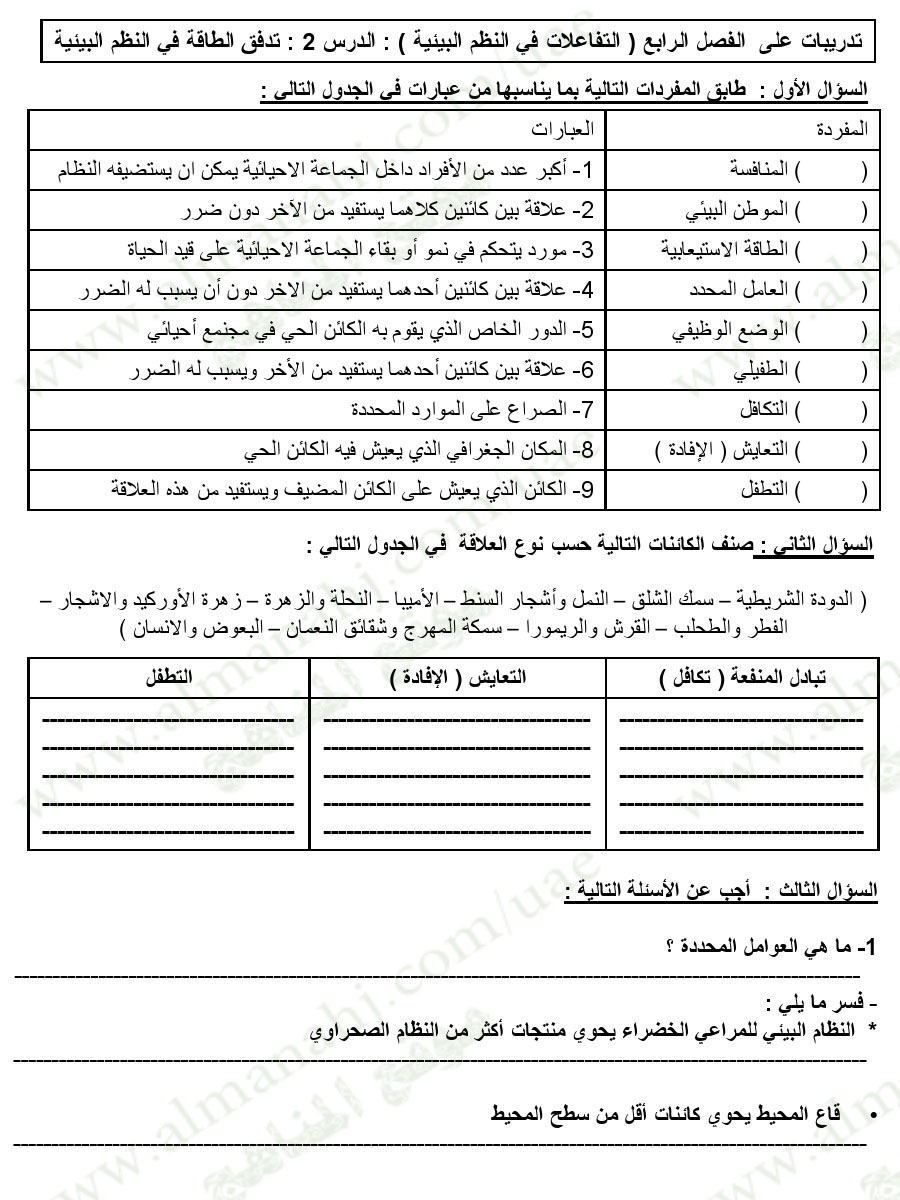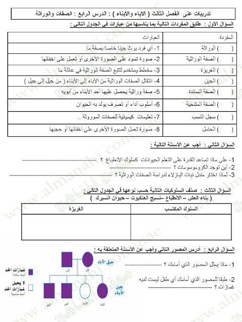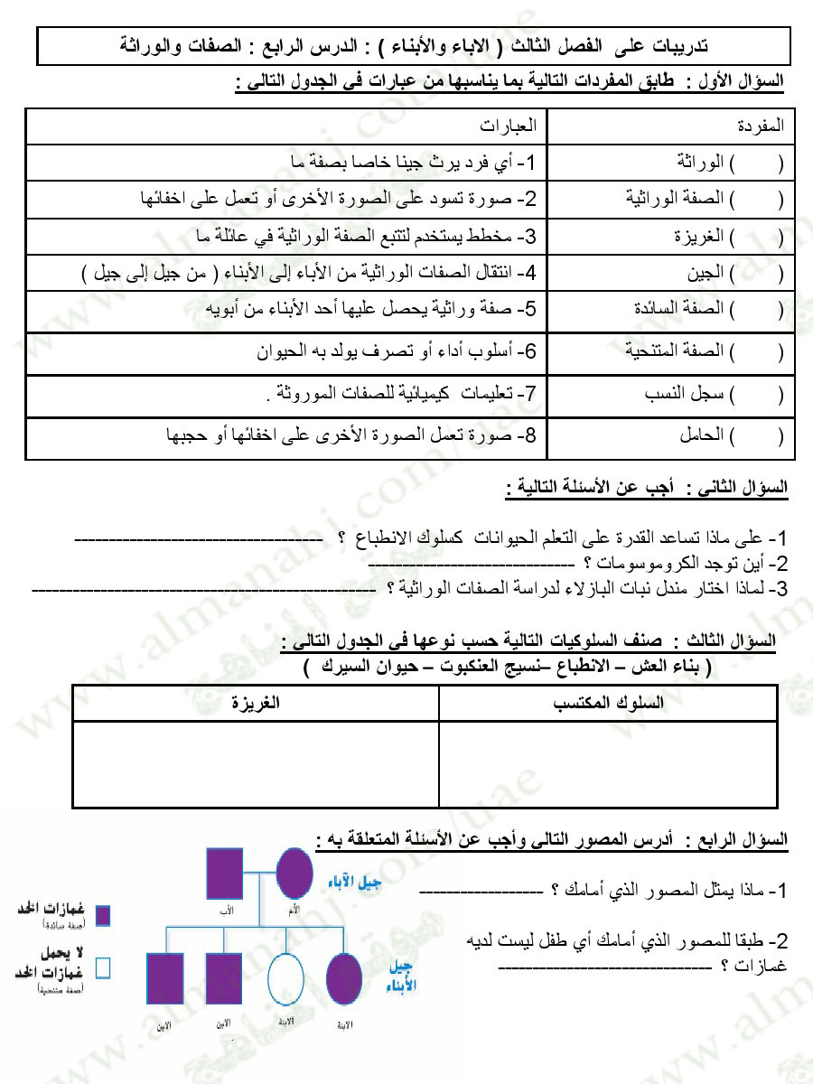 | تدريبات الوحدتين 3و4 (آباء وأبناء) والتفاعلات في النظم البيئية | ||