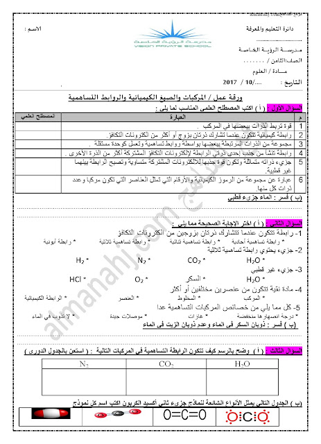 معلومات الملف: الصف الثامن, الفصل الأول, علوم, 2017-2018, ورقة عمل المركبات والصيغ الكيميائية والروابط التساهمية | |||