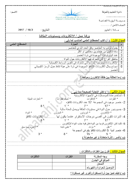 معلومات الملف: الصف الثامن, الفصل الأول, علوم, 2017-2018, ورقةعمل-الإلكترونات ومستويات الطاقة.pdf | |||