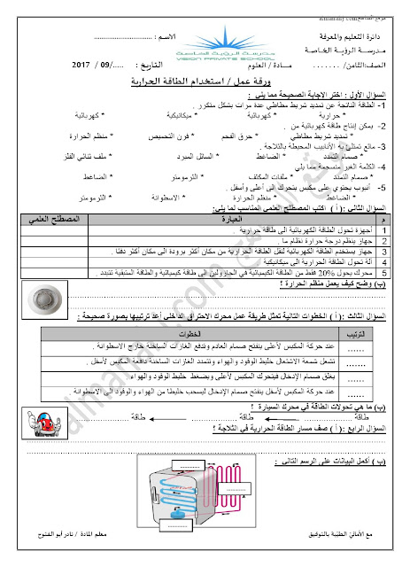 معلومات الملف: الصف الثامن, الفصل الأول, علوم, 2017-2018, ورقة عمل استخدامات الطاقة الحرارية | ||