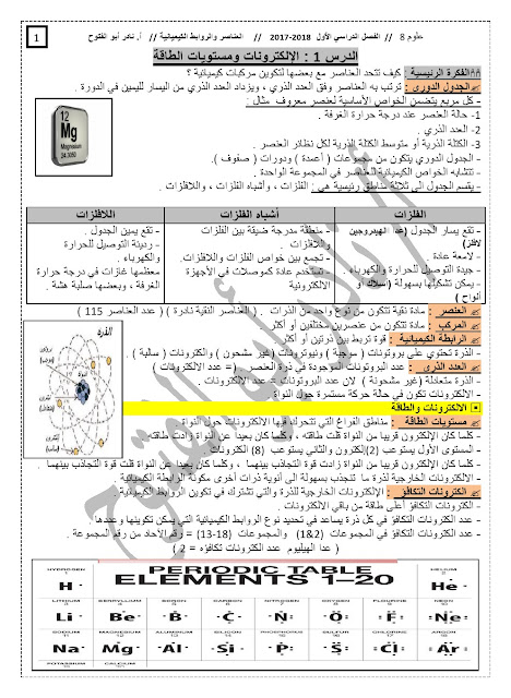 معلومات الملف: الصف الثامن, الفصل الأول, علوم, 2017-2018, ملخص العناصر والروابط الكيميائية | |||