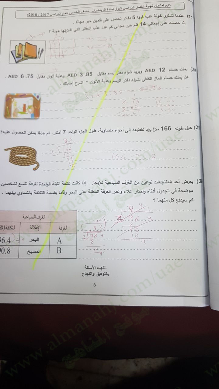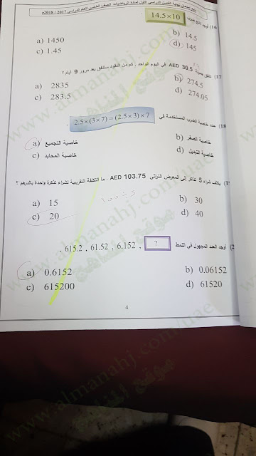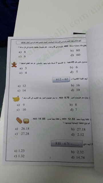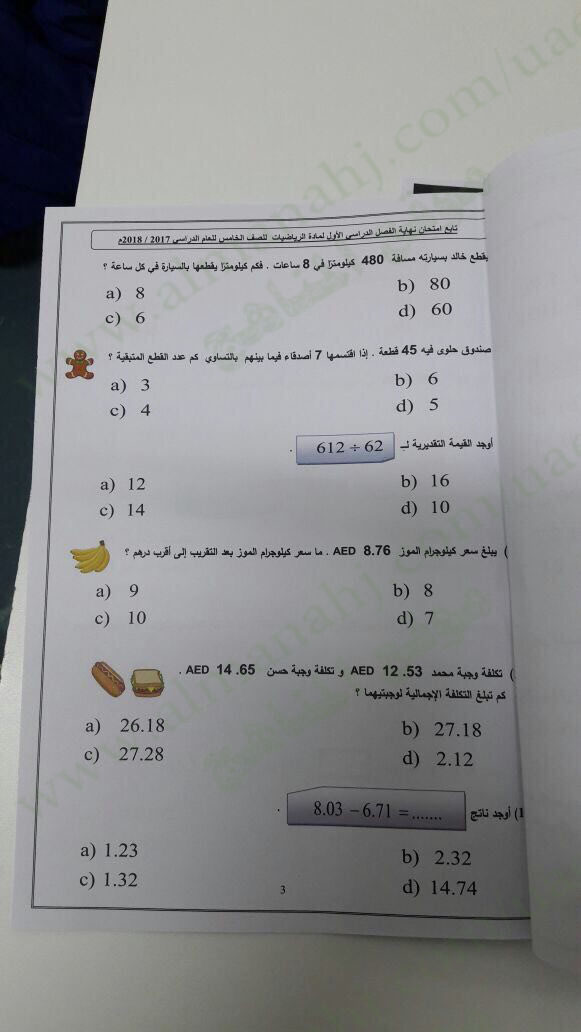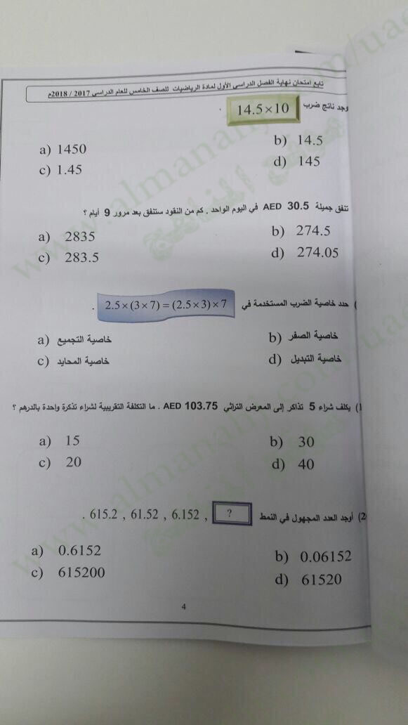 الصف الخامس, الفصل الأول, رياضيات, 2017-2018, الأسئلة الرسمية لامتحان نهاية الفصل الأول