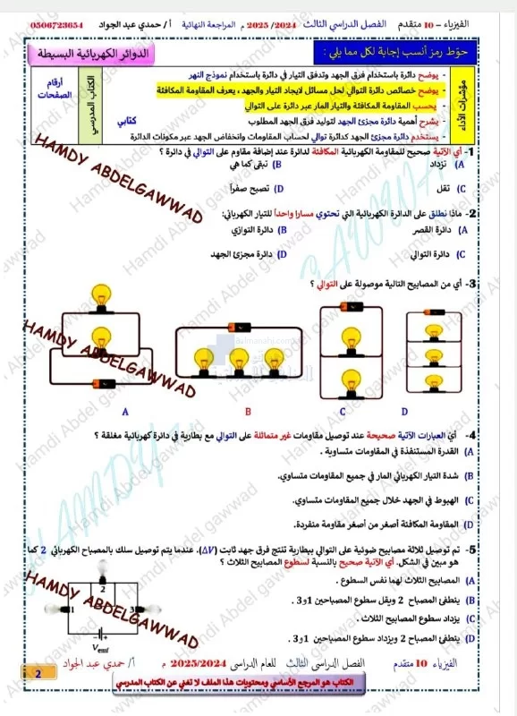 معلومات الملف: المراجعة النهائية وحدة الدوائر الكهربائية البسيطة بدون الحل