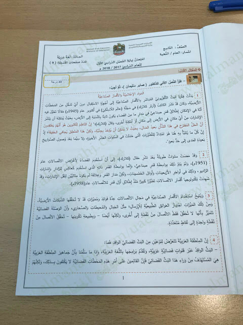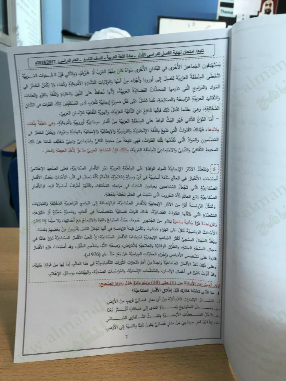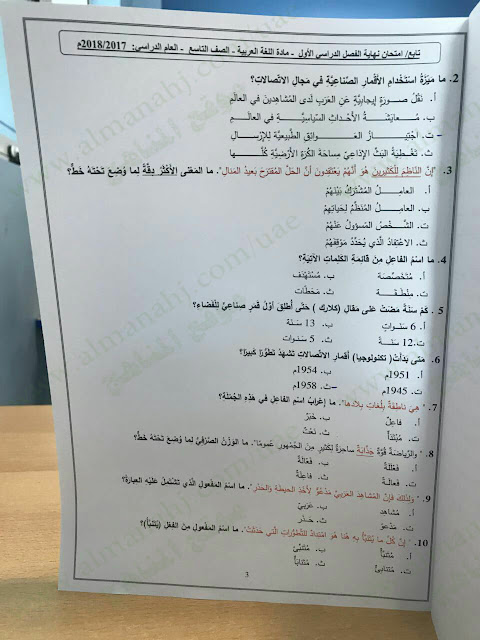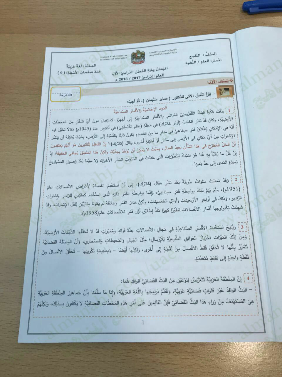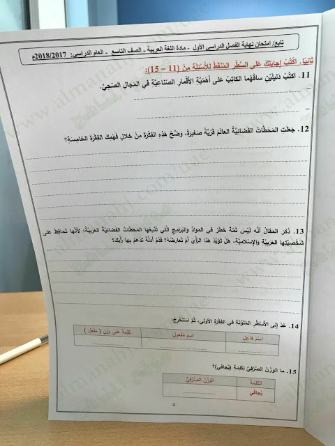 الصف التاسع, الفصل الأول, لغة عربية, 2017-2018, الاسئلة الرسمية لامتحان نهاية الفصل الاول