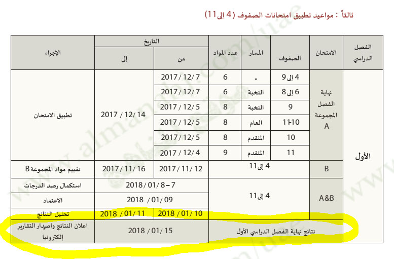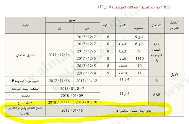 مواعيد إعلان نتائج امتحان نهاية الفصل الأول من للصفوف من الرابع وحتى الحادي | ||