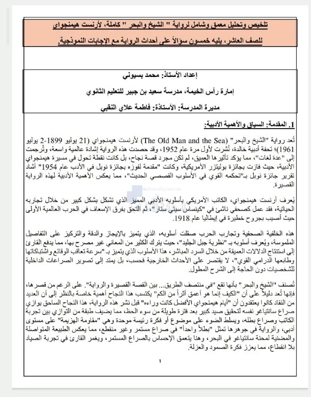 تم إيجاد الملف: تلخيص وتحليل لكامل رواية الشيخ والبحر و 50 سؤال مع الإجابات النموذجية