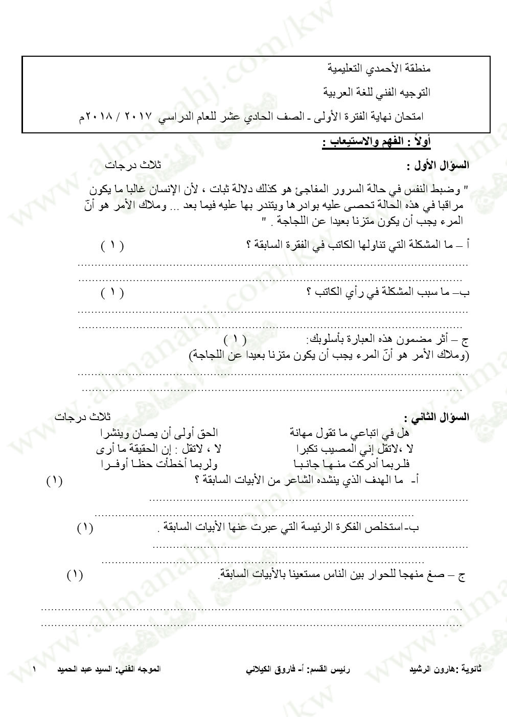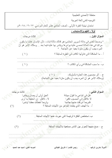 معلومات الملف: الحادي عشر, لغة عربية, الفترة الأولى, 2017-2018, الأحمدي, امتحان نهاية الفترة الاولى | |||