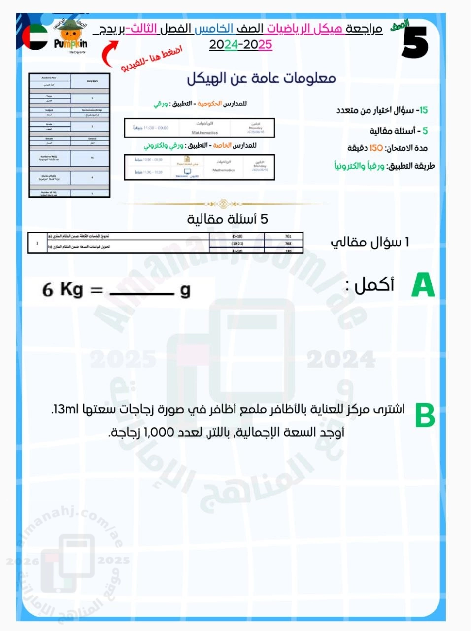 مراجعة للامتحان النهائي هيكل الرياضيات بريدج مع الحل بحسب الصف الخامس في مادة الرياضيات – الفصل الثالث