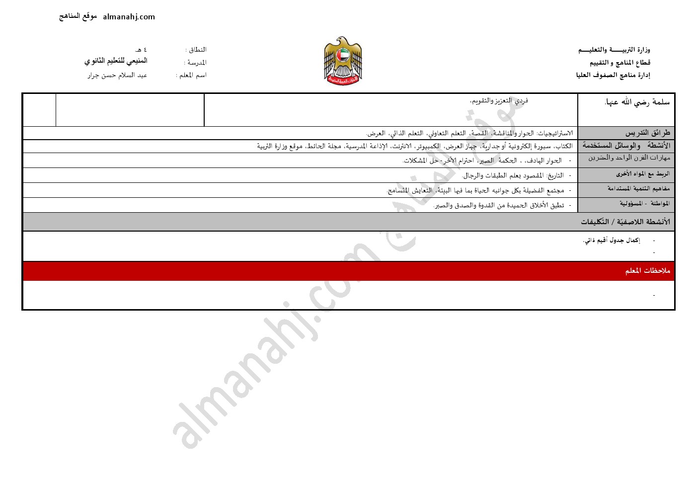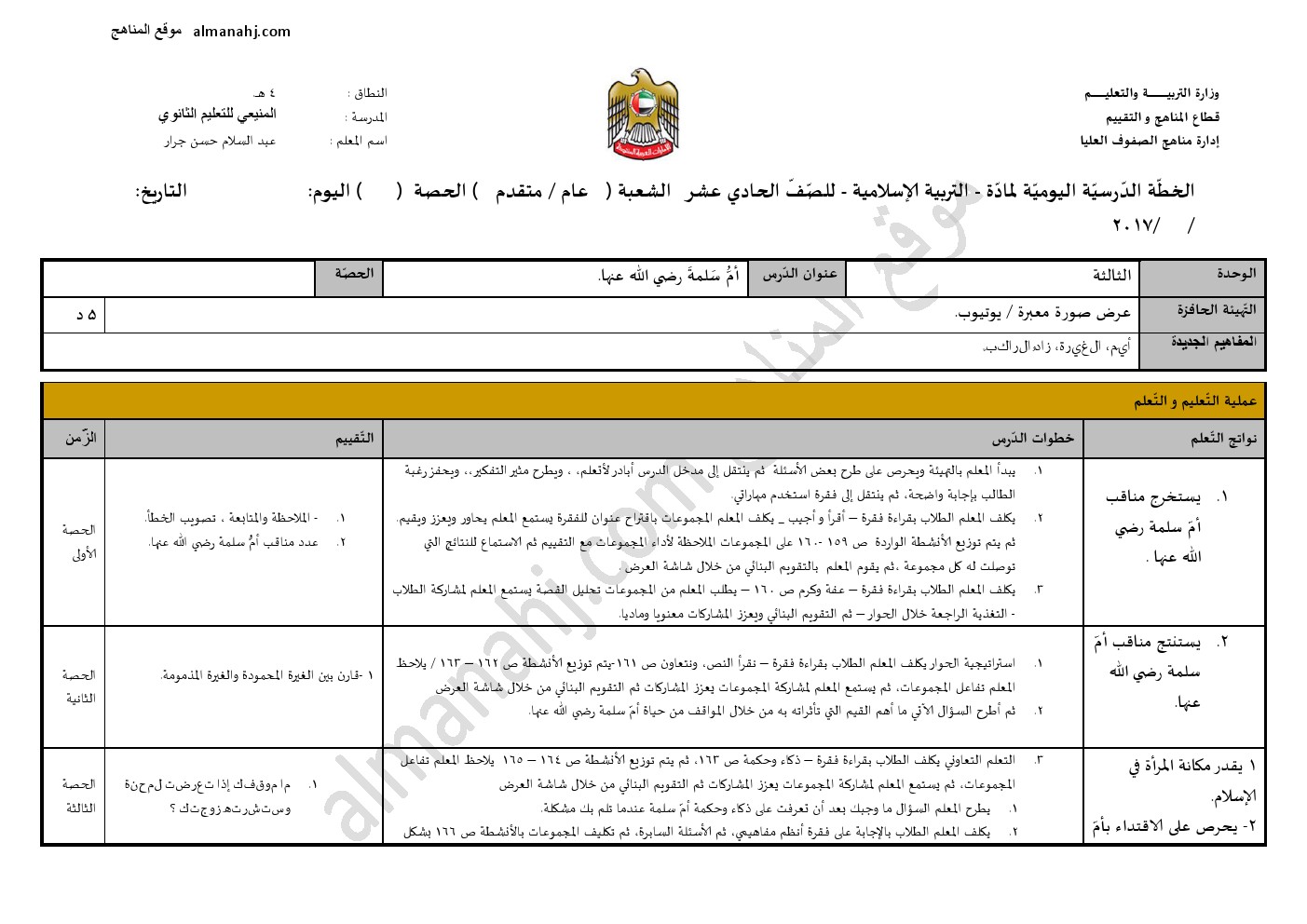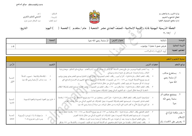 معلومات الملف: الصف الحادي عشر, الفصل الثاني, تربية اسلامية, 017-018, تحضير درس ( أم سلمة رضي الله عنها ) | |||