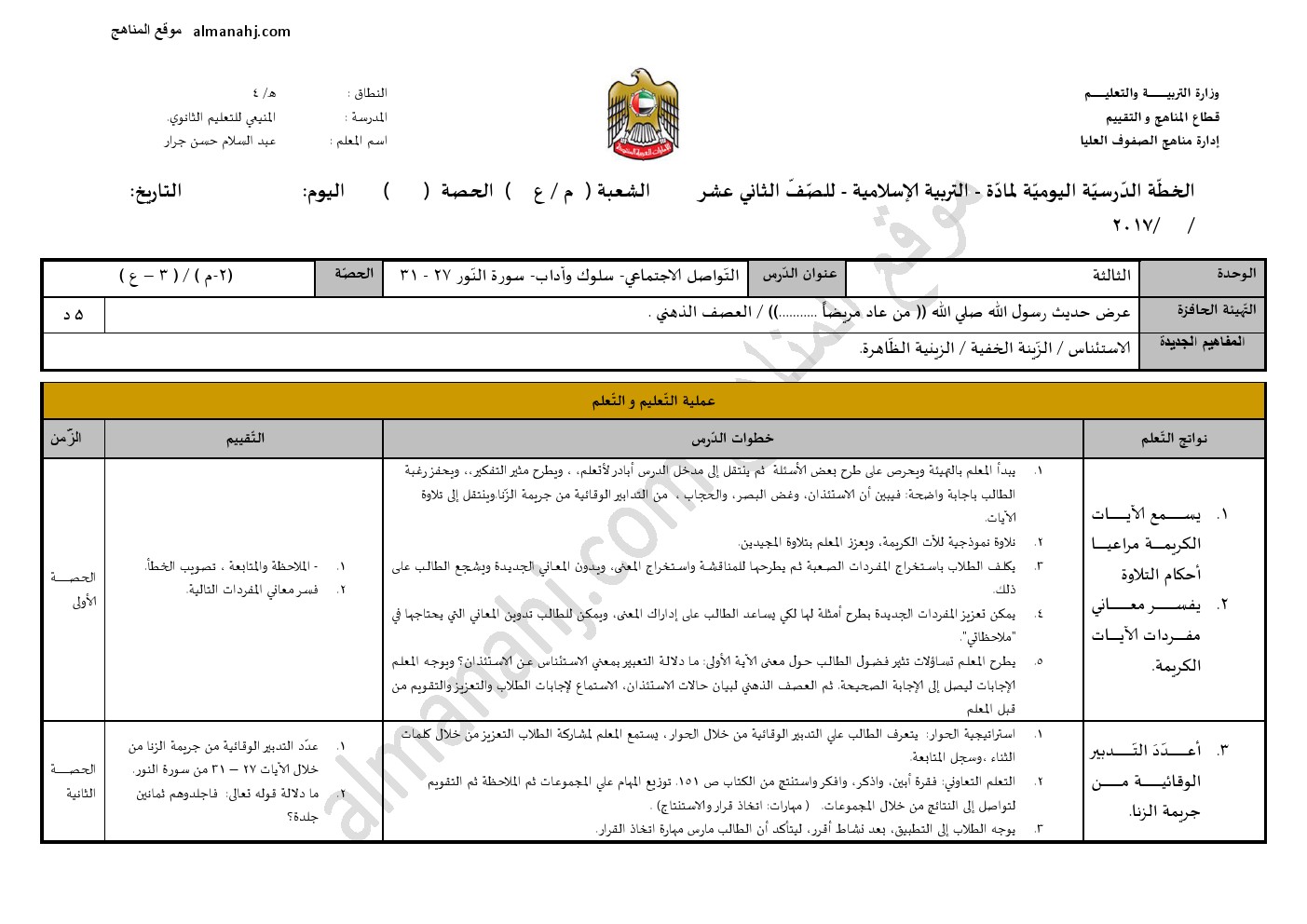 معلومات الملف: الصف الحادي عشر, الفصل الأول, تربية اسلامية, 2017-2018, تحضير درس ( التواصل الاجتماعي سلوك وآداب ) | |||
