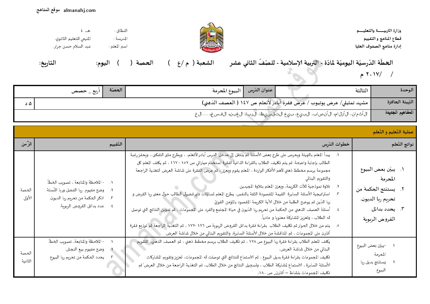 معلومات الملف: الصف الحادي عشر, الفصل الثاني, تربية اسلامية, 2017-2018, تحضير درس ( البيوع المحرمة ) | |||