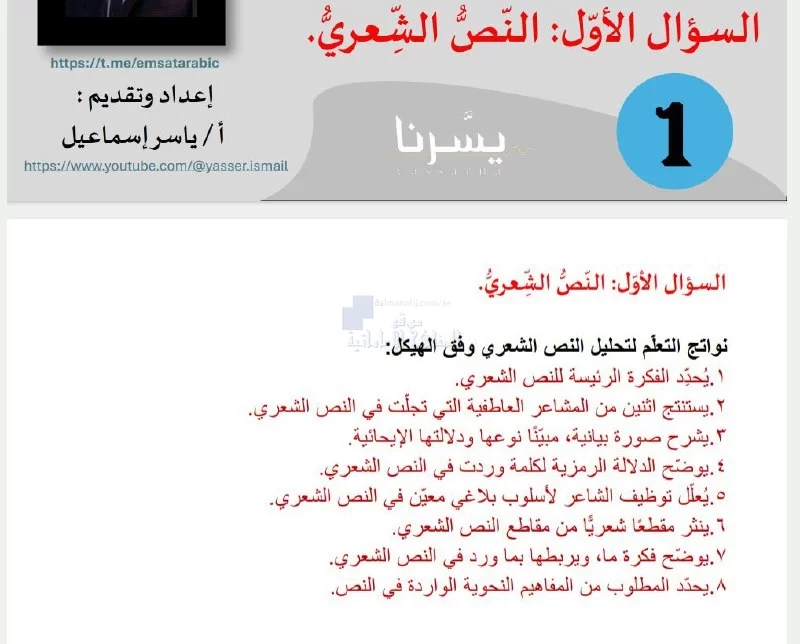 | نموذج تدريبي للاختبار الورقي وفق الهيكل الوزاري النص الشعري - إعداد: ياسر اسماعيل حسين | ||