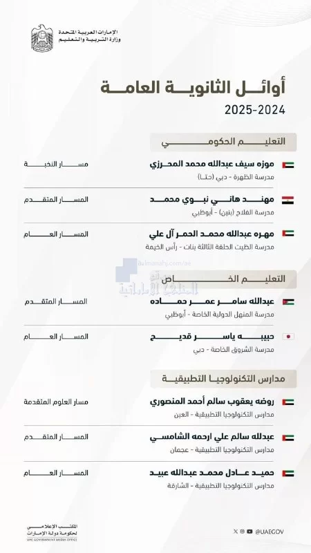 | محمد بن راشد يهنئ أوائل الثانوية العامة على مستوى الدولة: موزة، ومهند، ومهرة، وعبدالله، وحبيبة، وروضة، وعبدالله، وحميد. وسموه يؤكد: مستقبل مشرق ينتظركم... في دولة مجيدة... تحب أبناءها... وتسعد بهم... دولة يهندس مستقبلها محمد بن زايد آل نهيان، لتكون أفضل بيئة لكم ولمن يأتي خلفكم من الأجيال القادمة. هذا و قد بارك صاحب السمو الشيخ محمد بن راشد آل مكتوم نائب رئيس الدولة رئيس مجلس الوزراء حاكم دبي "رعاه الله" لأوائل الثانوية العامة تفوقهم. وقال سموه عبر حسابه الرسمي على منصة "إكس": نبارك لطلابنا أوائل الثانوية العامة على مستوى الدولة تفوقهم .. موزة ومهند ومهرة وعبدالله وحبيبة وروضة وعبدالله وحميد … يستحقون أن نذكر أسماءهم .. لأننا نفخر بهم .. ونبارك لأهلهم .. ونبارك ونفخر بجميع خريجي الثانوية العامة في دولة الإمارات …ونبارك لأسرهم ولآبائهم وأمهاتهم .وشكرنا لجميع العاملين في ميدان التربية والتعليم .. ونخص الشيخ عبدالله بن زايد والشيخة مريم بنت محمد بن زايد في مجلس التعليم .. وجميع المعلمين والإداريين والتربويين .. وموقع المناهج يبارك للطلبة المتفوقين هذا الإنجاز الباهر لما فيه خير الإمارات والأمة الإسلامية .... تضمنت قائمة أوائل الثانوية العامة على مستوى الدولة للتعليم الحكومي: مسار النخبة موزة سيف عبدالله محمد المحرزي من مدرسة الظفرة - دبي (حتا) المسار المتقدم مهند هاني نبوي محمد من مدرسة الفلاح (بنين) - أبوظبي المسار العام مهرة عبدالله محمد الحمرا آل علي من مدرسة سعيد الحلقة الثالثة بنات - رأس الخيمة التعليم الخاص:المسار المتقدم عبدالله سامر عمر حماده من مدرسة المنزل الدولية الخاصة - أبوظبي المسار العام حبيبة ياسر قديح من مدرسة الشروق الخاصة - دبي مدارس التكنولوجيا التطبيقية: مسار العلوم المتقدمة روضة يعقوب سالم أحمد المنصوري مدارس التكنولوجيا التطبيقية - العين المسار المتقدم عبدالله سالم علي أرومه الشامسي مدارس التكنولوجيا التطبيقية - عجمان المسار العام حميد عادل محمد عبدالله عبيد مدارس التكنولوجيا التطبيقية - الشارقة | ||
