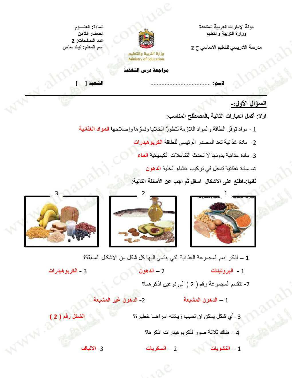 الصف الثامن, الفصل الثاني, علوم, 2017-2018, مراجعة درس ( التغذية )