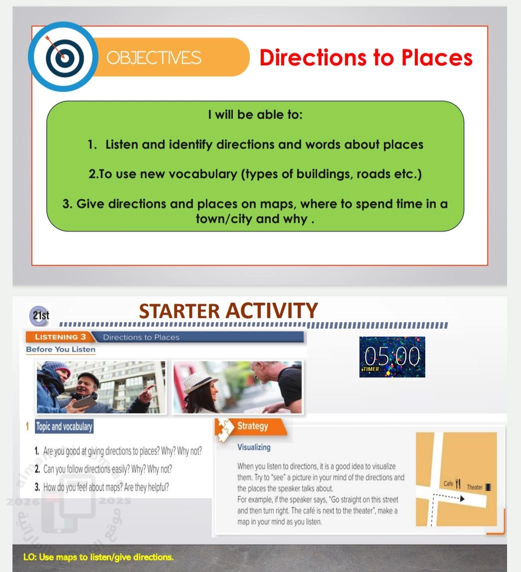 | حل أسئلة الدرس الثالث Directions to places من كتاب الاستماع المسار العام | ||