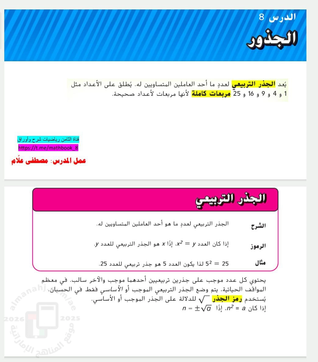 تم إيجاد الملف: حل أسئلة الدرس الثامن الجذور من الوحدة الأولى