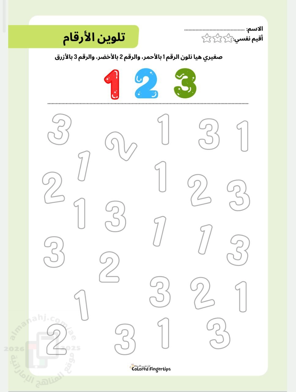 معلومات الملف: تدريبات حول تمييز الأرقام من واحد إلى ثلاثة عن طريق تلوينها بألوان مختلفة | ||