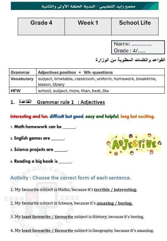 أوراق عمل درس School Life من الوحدة الأولى People and Places - إعداد: مجمع زايد التعليمي | ||