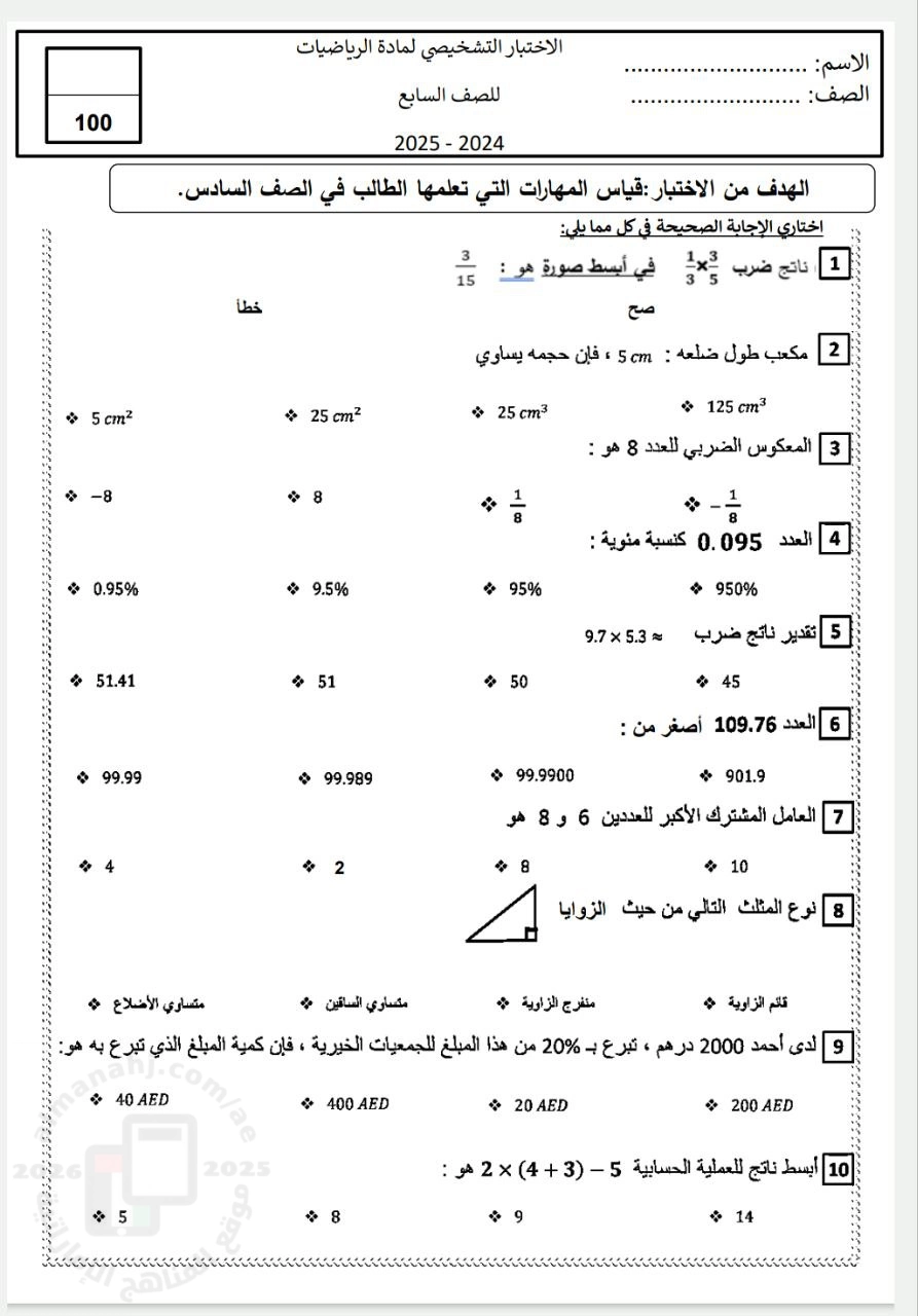 | أسئلة اختبار تشخيصي الفصل الأول بدون الحل | ||
