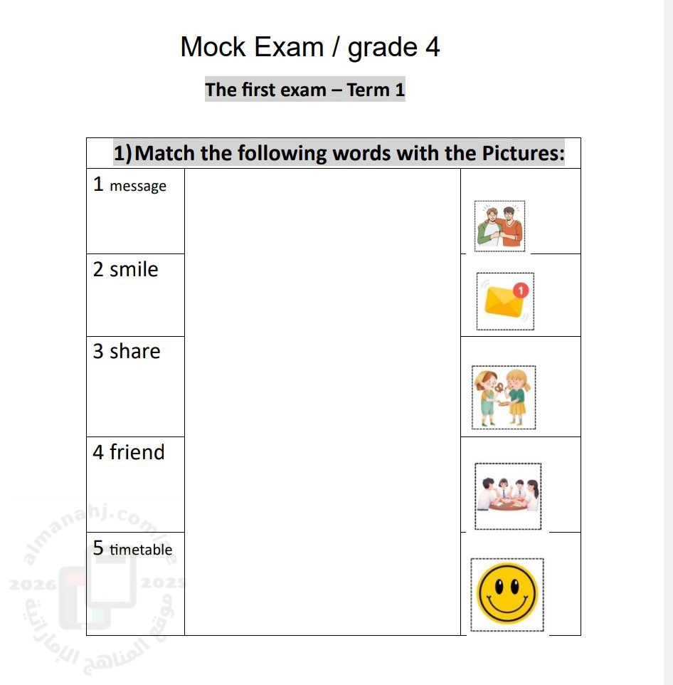 معلومات الملف: أسئلة اختبار تجريبي للتقويم الأول بدون الحل لقياس مهارات الطالب في فهم المفردات و القواعد و الكتابة | ||