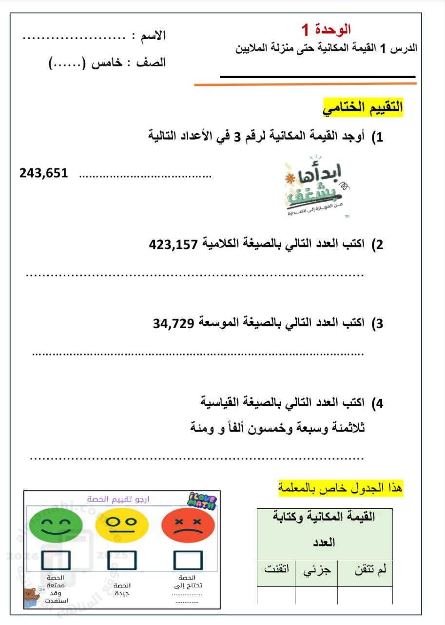 ورقة عمل الدرس الأول القيمة المكانية حتى منزلة الملايين | ||