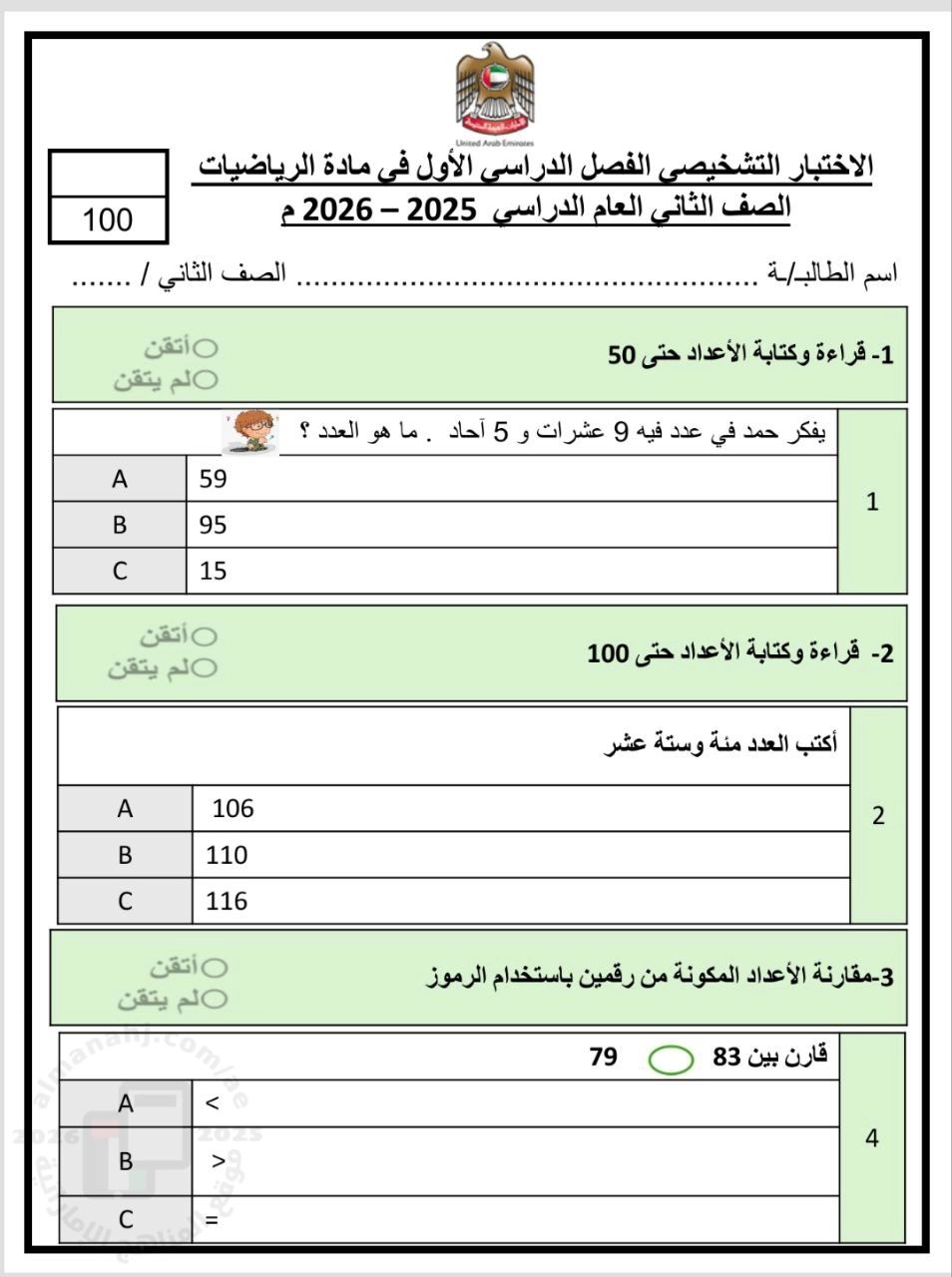 معلومات الملف: نموذج أسئلة اختبار تشخيصي من مجمع زايد التعليمي | ||