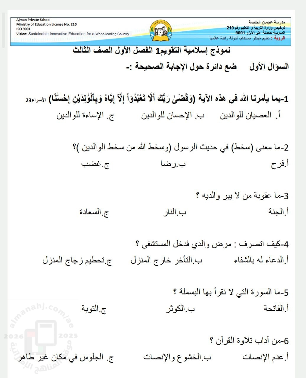 | نموذج أسئلة التقويم الأول - إعداد: مدرسة عجمان الخاصة | ||