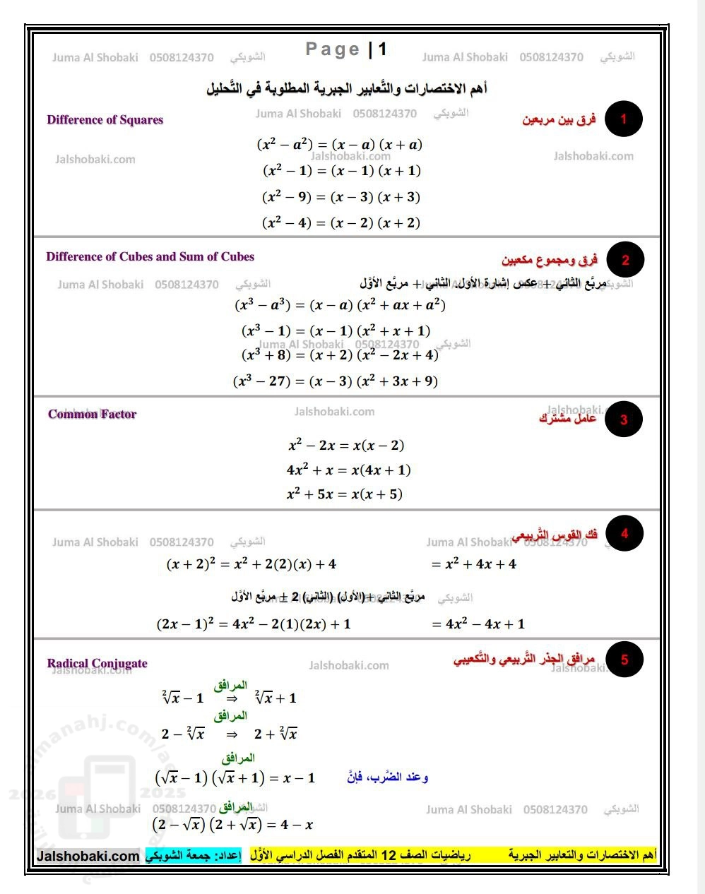 أهم الاختصارات والتعابير الجبرية المطلوبة في التحليل - إعداد: جمعة الشوبكي | |||
