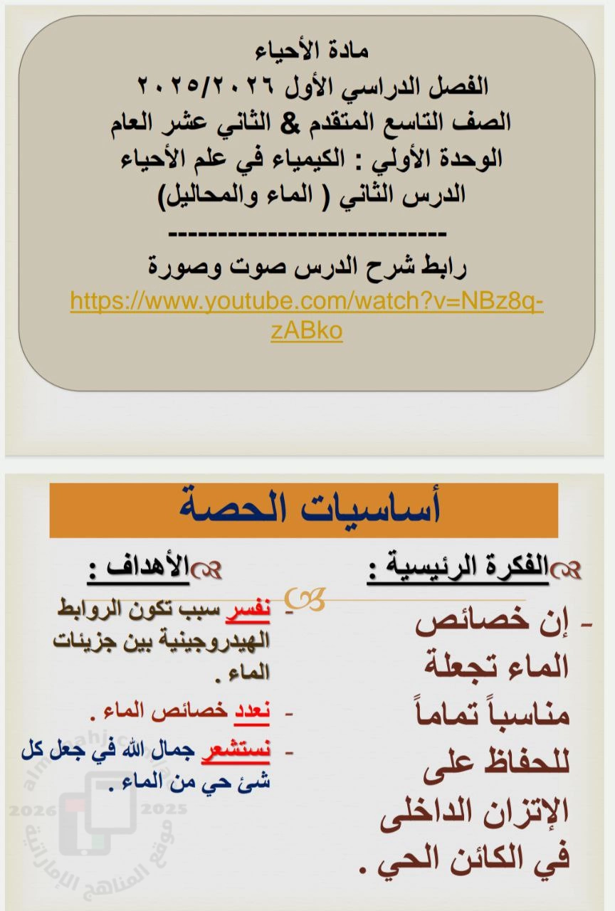تم إيجاد الملف: شرح الدرس الثاني الماء والمحاليل من الوحدة الأولى الكيمياء في علم الأحياء