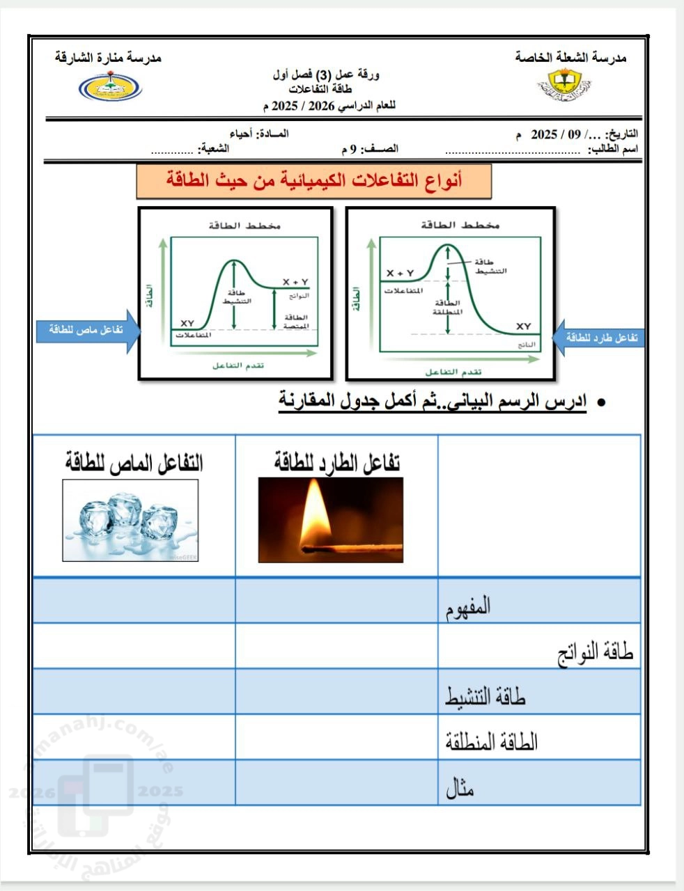 | ورقة عمل درس طاقة التفاعلات - إعداد: مدرسة الشعلة الخاصة | ||