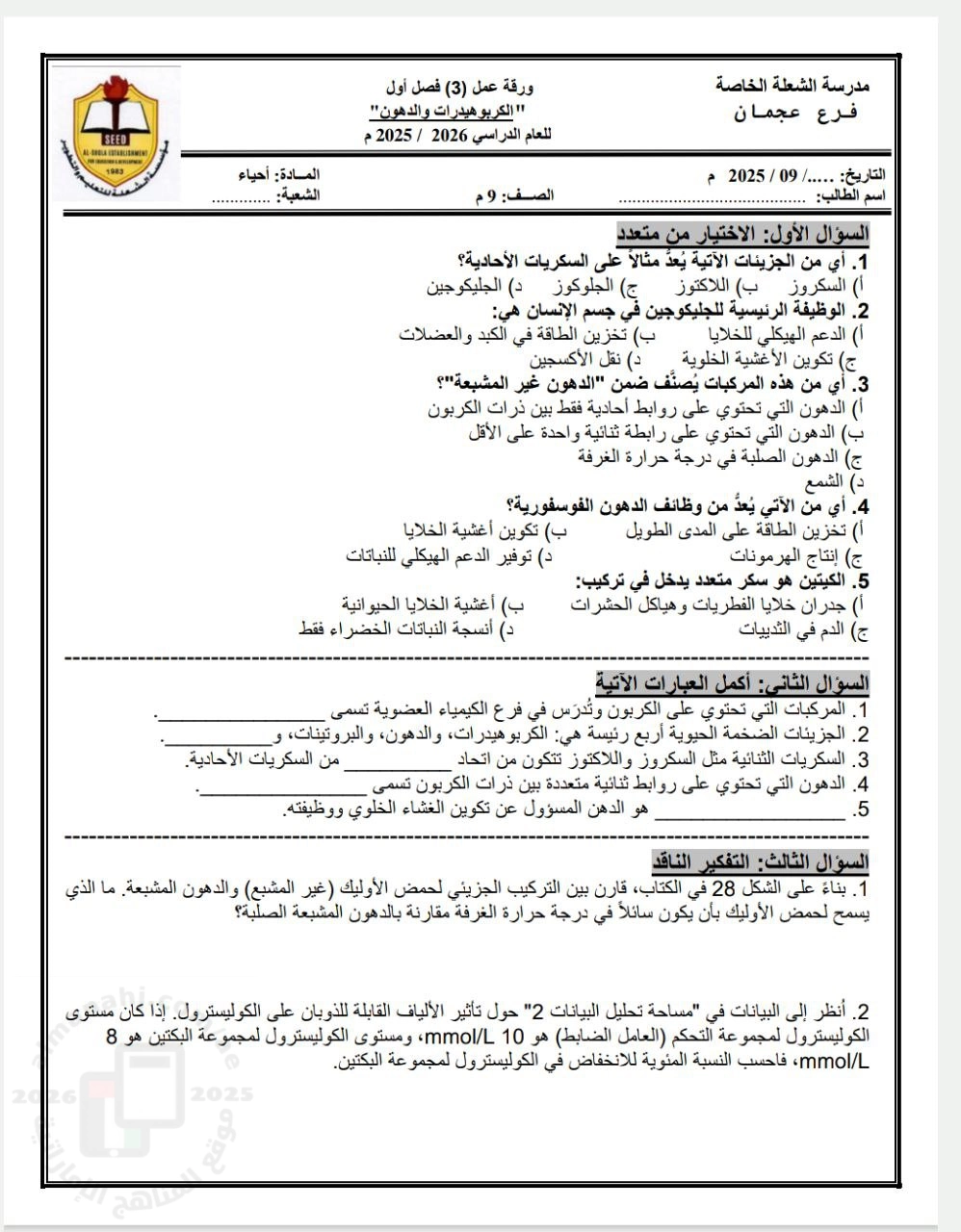ورقة عمل درس الكربوهيدرات والدهون - إعداد: مدرسة الشعلة الخاصة | ||