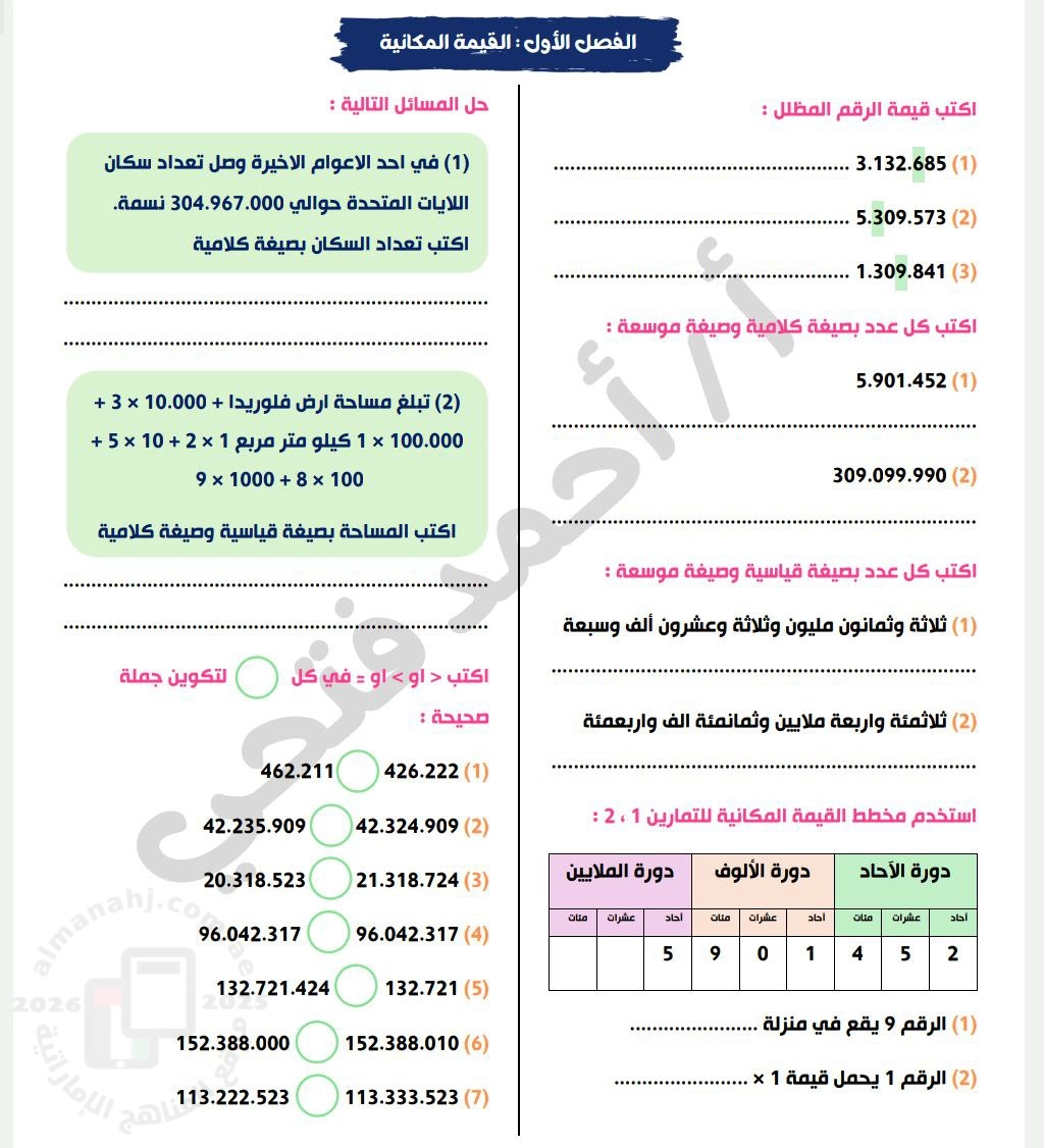| أوراق عمل مراجعة الوحدة الأولى القيمة المكانية - إعداد: أحمد فتحي | ||