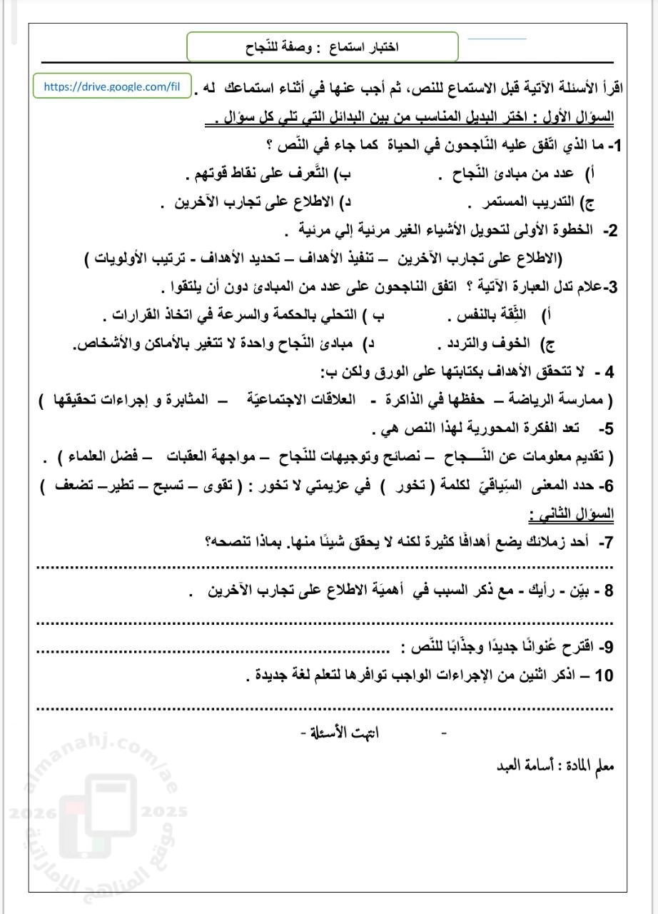 تم إيجاد الملف: ورقة عمل اختبار استماع درس وصفة نجاح