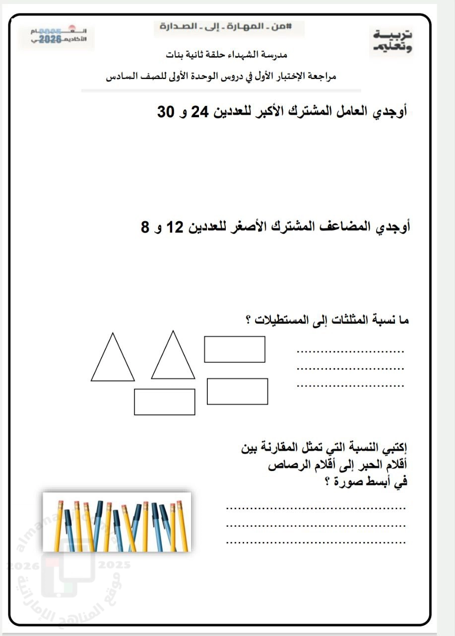 معلومات الملف: نموذج أسئلة الاختبار التكويني الأول في دروس الوحدة الأولى بدون الحل لقياس مهارات الطالب في العامل المشترك الأكبر ، و كتابة النسبة على هيئة كسر بأبسط صورة و إيجاد المضاعف المشترك الأصغر و إحداثيات نقطة | ||
