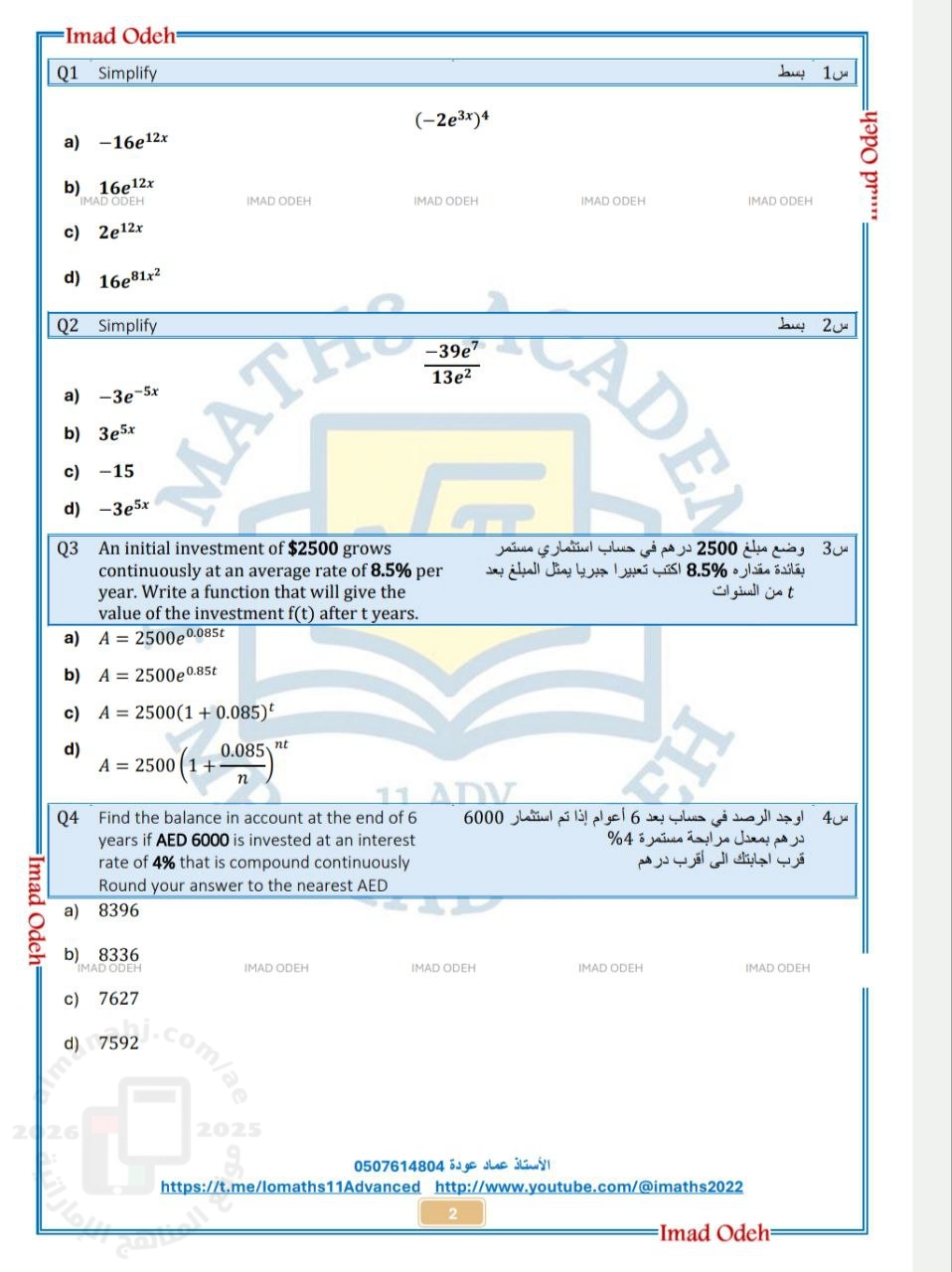 14. رياضيات, الفصل الأول, 2025-2026, أوراق عمل مراجعة الوحدة الثانية الدوال الأسية واللوغاريتمية