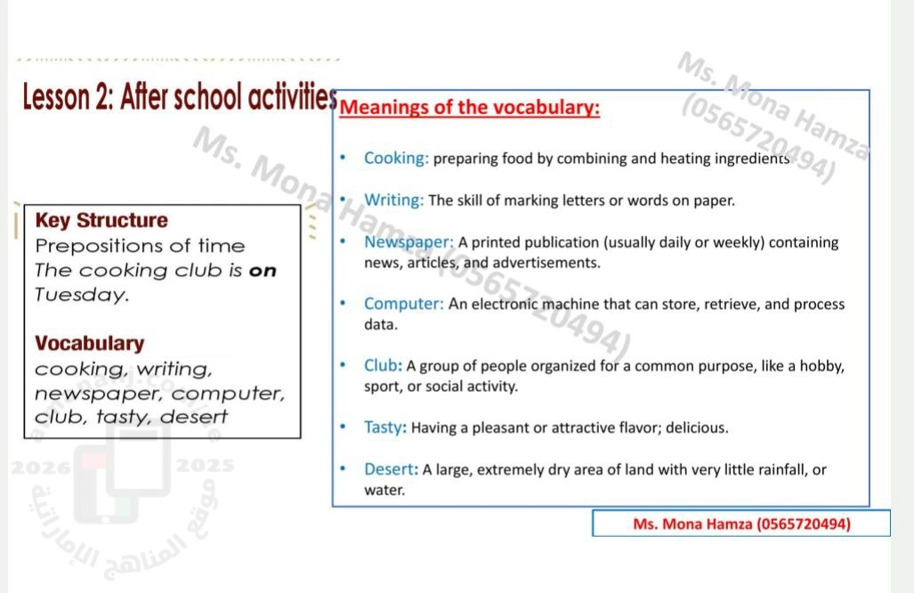 معلومات الملف: ملف حل الدرس الثاني : بعد نشاطات المدرسة Lesson 2 : After school activities من الوحدة الثالثة : المدرسة Unit 3 : School منهج أكسس access وفق المنهج الجديد | ||