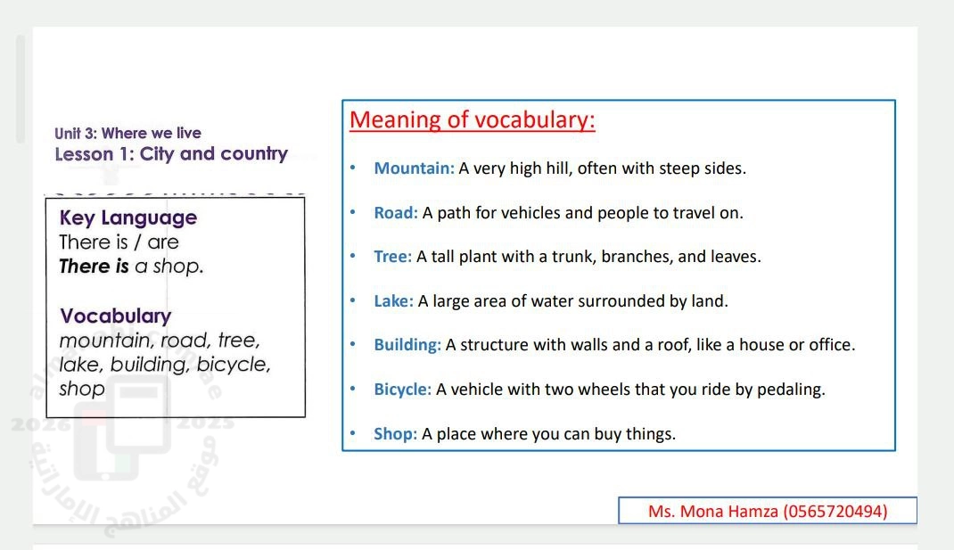 معلومات الملف: ملف حل الدرس الأول : المدينة والريف Lesson 1 : City and country من الوحدة الثالثة : أين نسكن Unit 3 : Where we live منهج أكسس access وفق المنهج الجديد | ||
