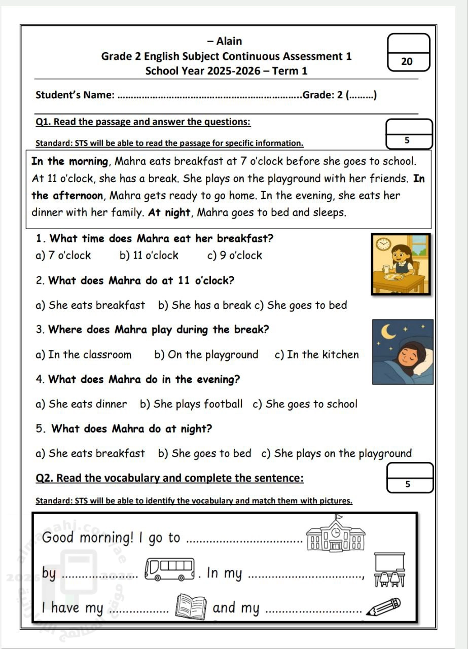معلومات الملف: أسئلة Continuous Assessment 1 اختبار التقييم المستمر الأول و تحتوي على نص Reading comprehension و أسئلة متعلقة بالنص و ملء الفراغات و اختيار الكلمة الصحيحة | ||