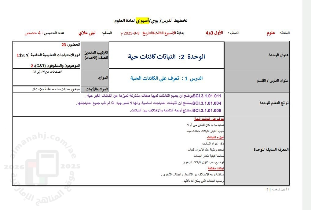 تم إيجاد الملف: التخطيط الدرسي الأسبوعي للوحدة الثانية النباتات كائنات حية