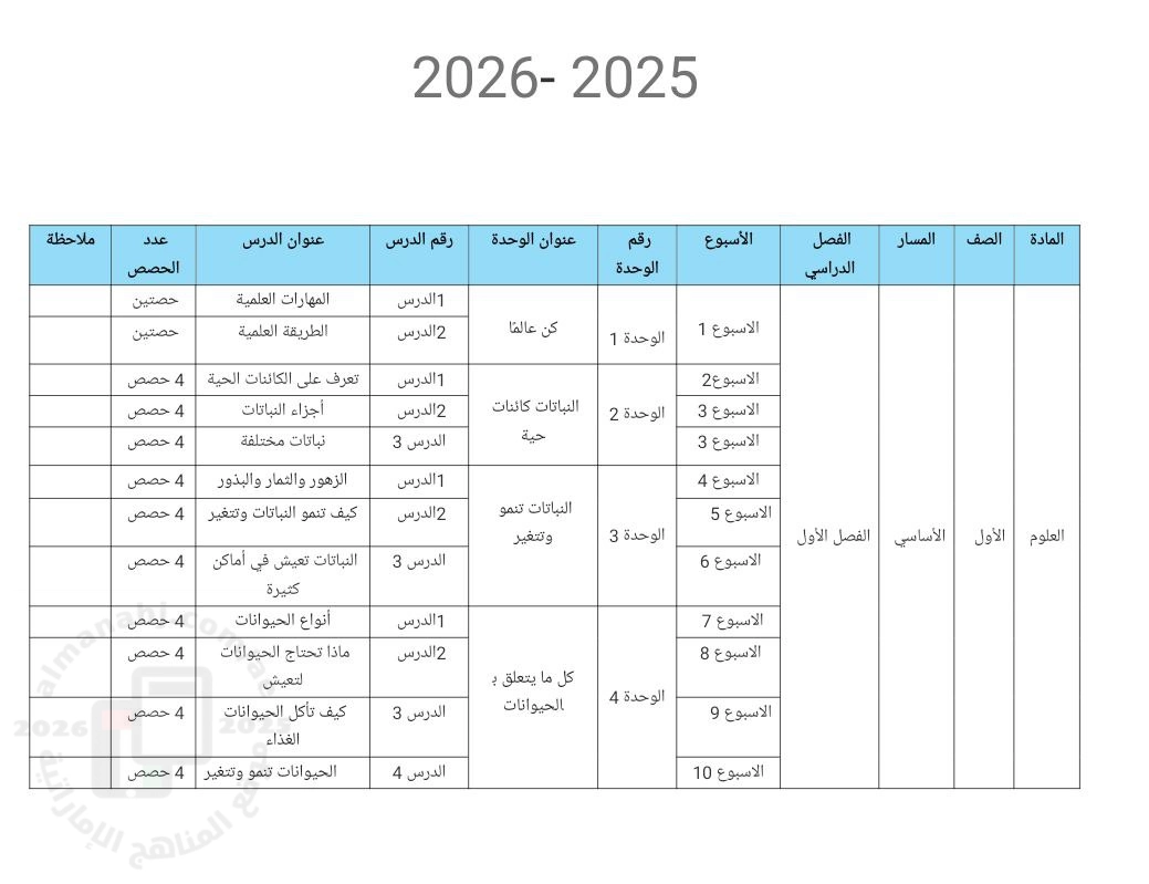 معلومات الملف: مصفوفة المدى و التتابع الخطة الفصلية للوحدات المقررة في الفصل الأول الوحدة 1: كن عالماً الوحدة 2: النباتات كائنات حية الوحدة 3: النباتات تنمو و تتغير الوحدة 4: كل ما يتعلق بالحيوانات | ||