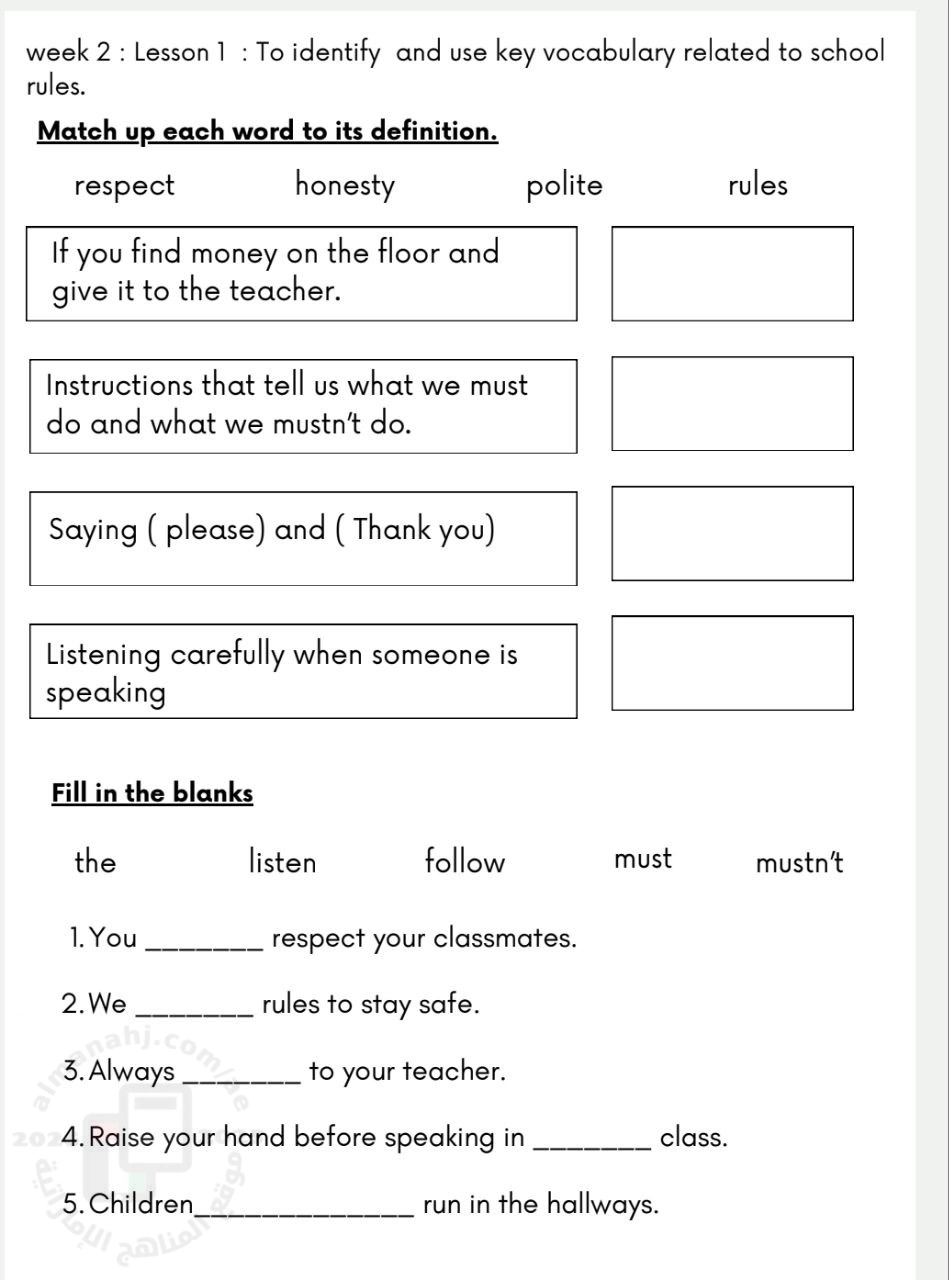 معلومات الملف: أوراق عمل الدرسين الأول و الثاني من الأسبوع الثاني بدون الحل و يشمل ما يلي : week 2 : Lesson 1 : To identify and use key vocabulary related to school rules week 2 : Lesson 2 : To use modal verbs ( must , mustn’t , should , shouldn’t ) | ||
