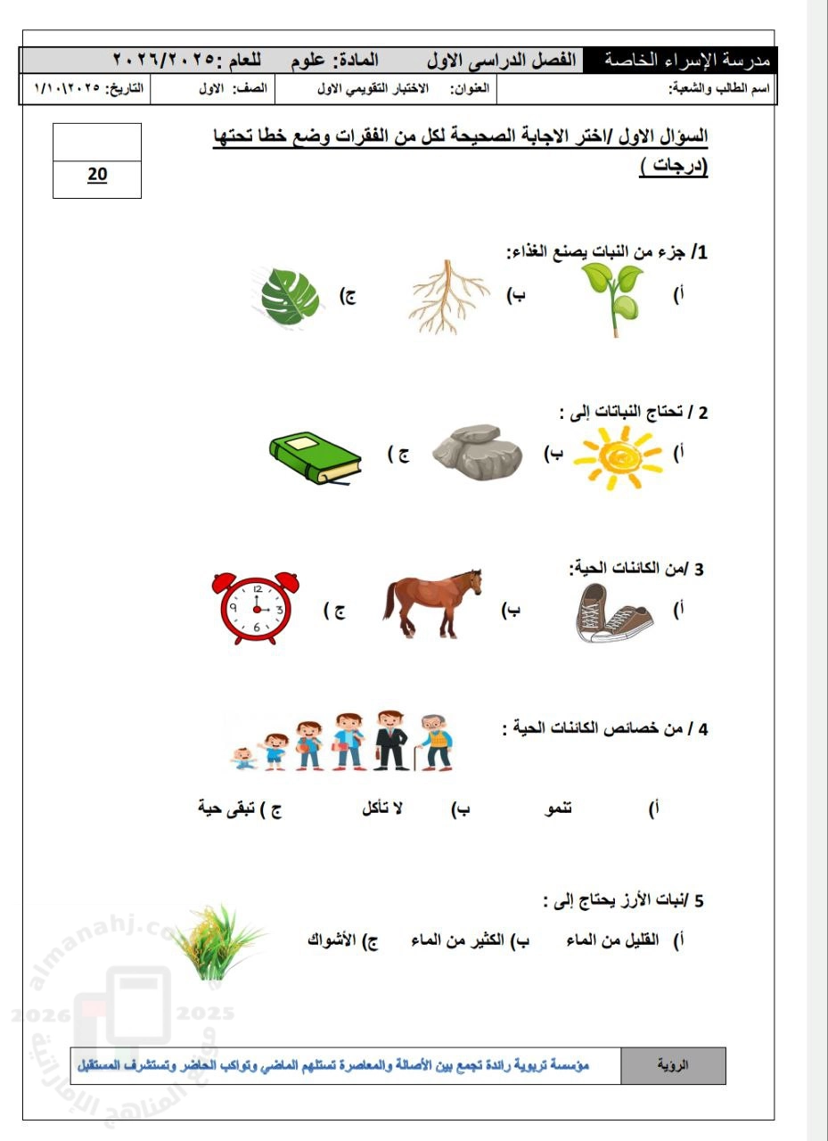 معلومات الملف: نموذج أسئلة الاختبار التقويمي الأول بدون الحل نواتج التعلم : يتعرف الطالب أجزاء النبات التي تصنع الغذاء يتعرف ما يحتاج النبات لينمو يتعرف الكائنات الخية و خصائصها | ||