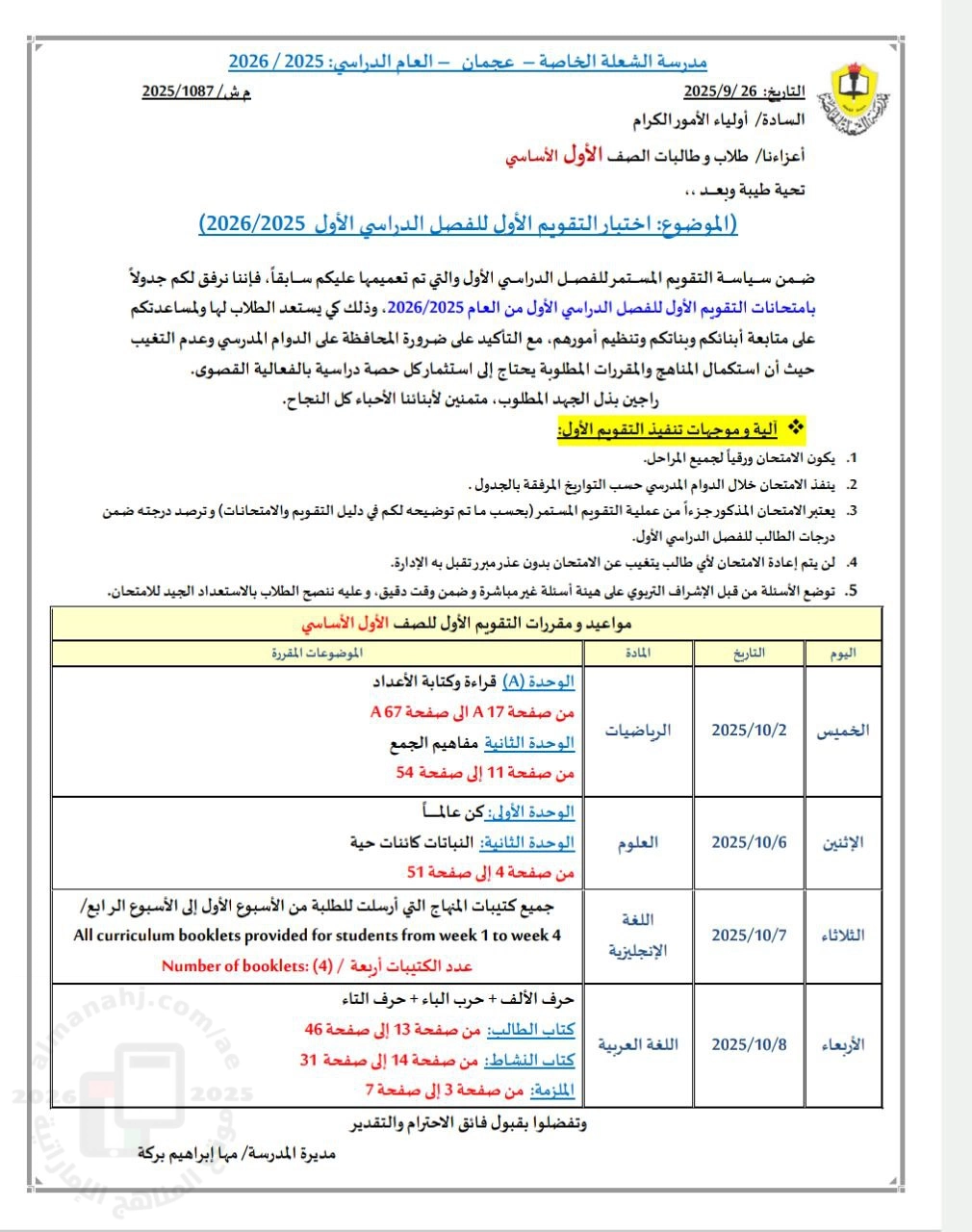 معلومات الملف: الموضوع: اختبارالتقويم الأول للفصل الدراسي الأول 2026/2025 ضـــمن ســـياســـة التقويم المســـتمر للفصــل الدراسـي الأول والتي تم تعميمها عليكم ،فإننا نرفق لكم جداول امتحانات التقويم الأول للفصل الدراس الأول العام ،2026/2025 وذلك كي يستعد الطالب لها ولمساعدتكم على متابعة أبنائكم وبناتكم وتنظيم أمورهم، مع التأكيد على ضـرورة المحافظة على الدوام المدرسـي وعدم التغيب حيث أن استكمال المناهج والمقررات المطلوبة يحتاج إلى استثمار كل حصة دراسية بالفعالية القصوى. راجين بذل الجهد المطلوب، متمنين كل النجاح. آلية و موجهات تنفيذ التقويم الأول : .1 لجميع المراحل يكون الامتحان ورقيا .2 ينفذ الامتحان خلال الدوام المدرسي حسب التواريخ المرفقة بالجدول . .3 يعتبـر الامتحان المذكور جزءاً من عمليـةالتقـويم المسـتمر .4 لن يتم إعادة الامتحان لأي طالب يتغيب عن الامتحان دون عذر مبررتقبل به الإدارة. .5 توضع الأسئلة من قبل الإشراف التربوي على هيئة أسئلة غير مباشرة وضمن وقت دقيق، وعليه ننصح الطلاب بالاستعداد الجيد للامتحان | ||