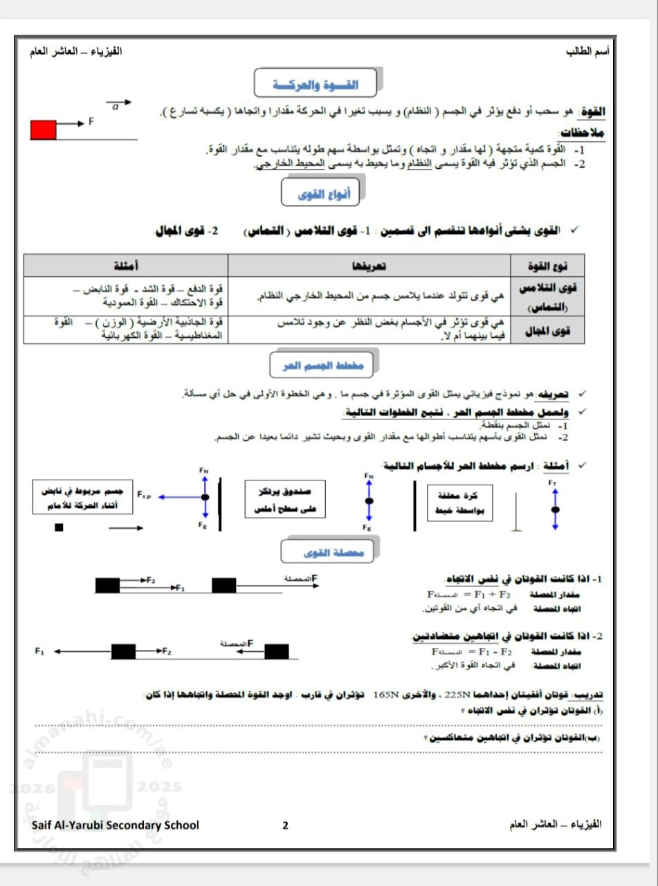 معلومات الملف: مذكرة شاملة الوحدة الأولى مع تدريبات و تشمل مايلي : القوة و الحركة أنواع القوى مخطط الجسم الحر محصلة القوى قوانين نيوتن الثلاثة تطبيقات على قانون نيوتن الثاني المتجهات الاحتكاك و الحركة | ||