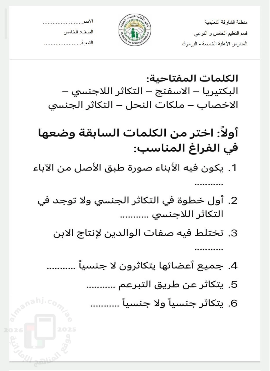 | معلومات الملف: ورقة عمل عن درس التكاثر بدون الحل يتمكن الطالب من اختيار الكلمة المناسبة و وضعها في الفراغ المناسب البكتيريا - الاسفنج - التكاثر الجنسي - التكاثر اللاجنسي - الإخصاب - ملكات النحل يتمكن من المقارنة بين التكاثر الجنسي و التكاثر اللاجنسي | ||